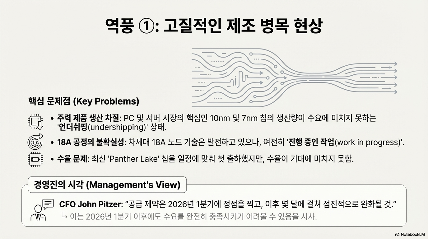 월스트리트가 회의적인 이유는 인텔이 여전히 핵심적인 실행 문제와 씨름하고 있기 때문입니다. 10나노 및 7나노 칩의 제조 병목 현상과 공급 제약이 지속되고 있으며, 비용이 많이 드는 18A 공정 전환으로 인한 총마진 축소에 대한 우려도 큽니다. 핵심 기술인 18A 노드 역시 여전히 '진행 중인 과제'로 남아있습니다.