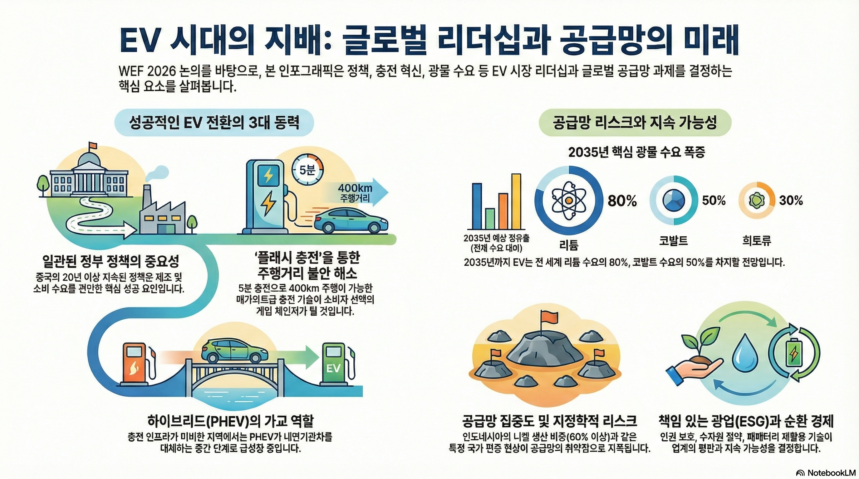 하지만 전기차의 미래를 형성하는 진짜 힘은 우리가 생각하는 것보다 훨씬 더 복잡하고 놀랍습니다. 최근 세계경제포럼(WEF)에서는 정책, 제조, 광산업계를 대표하는 글로벌 리더들이 모여 전기차의 미래를 논의했습니다. 그들의 대화를 통해 우리는 전기차 경쟁의 승패가 배터리 화학자가 아닌 관료들의 손에 달려 있을 수 있으며, 최고의 정부 지원은 막대한 현금이 아니라 예측 가능한 계획이라는 사실을 엿볼 수 있습니다.