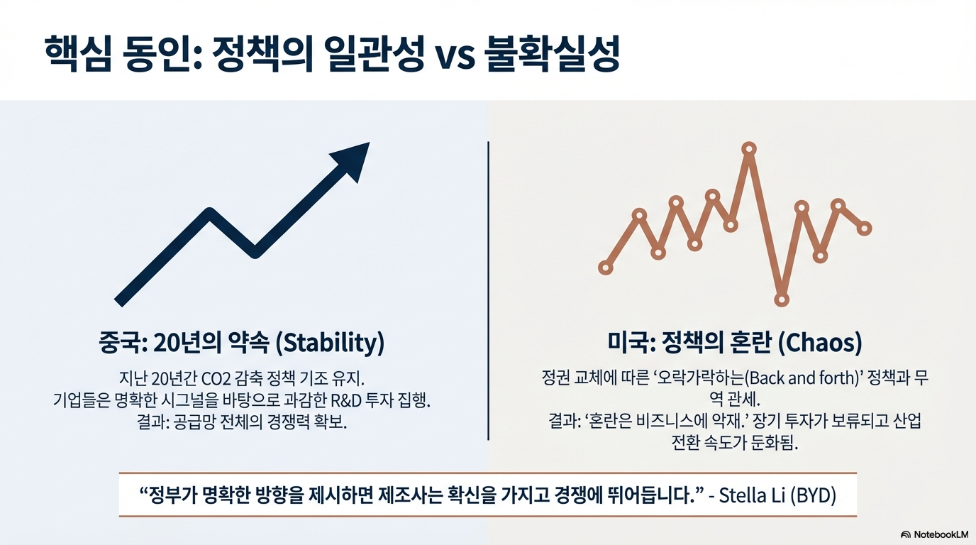 흔히 중국 전기차 산업의 성공 비결을 막대한 보조금에서 찾지만, 핵심은 다른 곳에 있었습니다. 제조업계를 대표하는 BYD의 스텔라 리(Stella Lee) 부사장에 따르면, 진짜 비결은 20년 이상 흔들림 없이 유지된 정부의 '일관된 정책'입니다. 중국 정부가 명확한 방향을 제시하자, 제조사들이 안심하고 장기적인 투자와 혁신에 매진할 수 있었다는 것입니다.