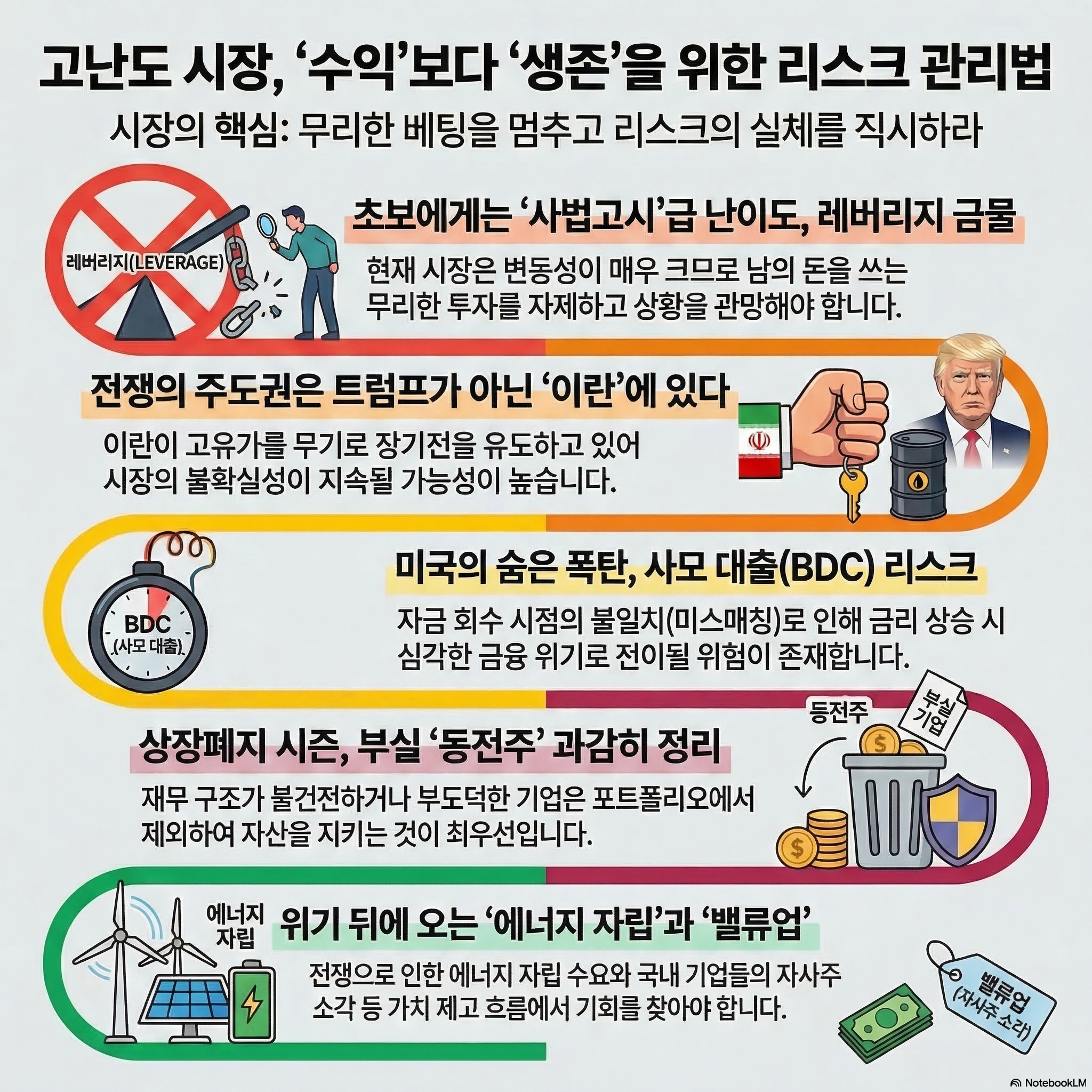 지난 1, 2월의 평온했던 상승장에 익숙해진 초보 투자자들에게 현재의 변동성은 거대한 장벽으로 다가오겠지만, 지금은 자책할 때가 아닙니다. 지금은 정보의 비대칭성과 '매크로 변동성 함정'이 극에 달한 시기입니다. 무리한 레버리지를 동원해 수익을 쫓기보다는, 한 걸음 물러나 대응을 자제하며 상황을 예의주시하는 '생존'이 그 무엇보다 우선시되어야 하는 구간임을 명심하십시오.