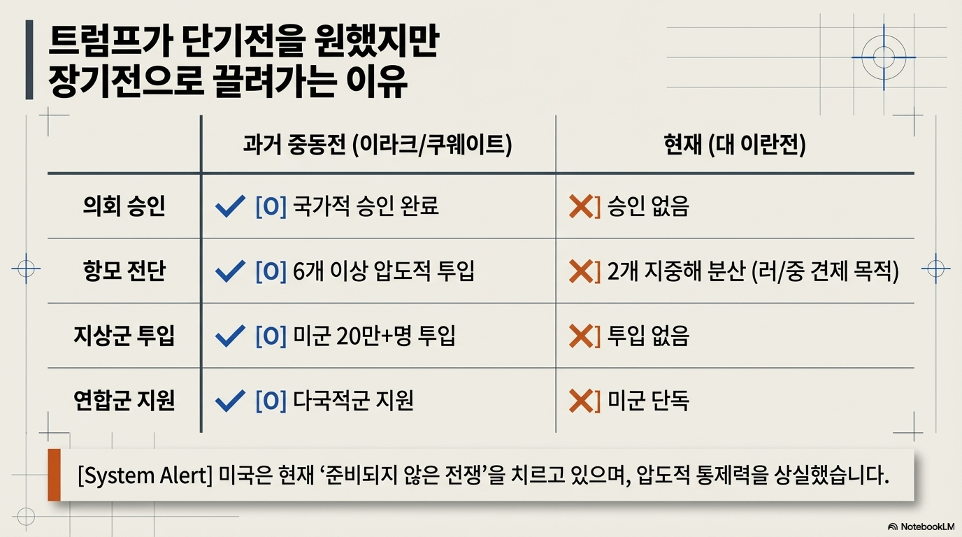 현재 중동의 긴장감이 시장을 짓누르고 있지만, 우리가 주목해야 할 것은 단순한 포성이 아닌 그 이면의 '지정학적 역학 관계'입니다. 이번 전쟁은 과거 미국이 압도적인 무력으로 제압했던 이라크전이나 쿠웨이트전과는 판 자체가 다릅니다.