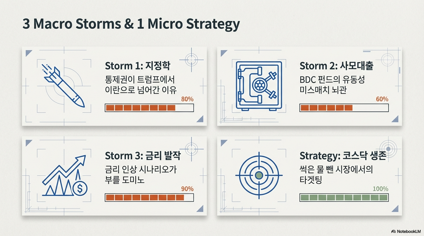 전문가들이 전쟁보다 더 깊이 우려하는 실질적인 위기는 수면 아래 '사모 대출(BDC, Business Development Company)' 시장에 숨어 있습니다. 이는 은행 문턱을 넘지 못하는 벤처나 신용등급 미달 기업들에 사모 펀드가 고금리(대략 10% 내외)로 돈을 빌려주는 시장인데, 현재 심각한 구조적 결함을 노출하고 있습니다.