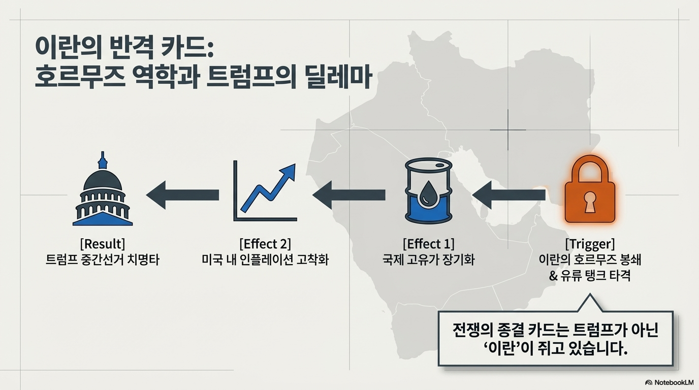 이 지점에서 전략적인 '카드'의 주인은 뒤바뀝니다. 트럼프는 중간 선거를 앞두고 조속한 종전과 유가 안정을 원하지만, 이란은 이 약점을 정확히 꿰뚫고 '호르무즈 해협 봉쇄'와 '고유가 유지'라는 카드로 미국을 코너에 몰아넣고 있습니다.