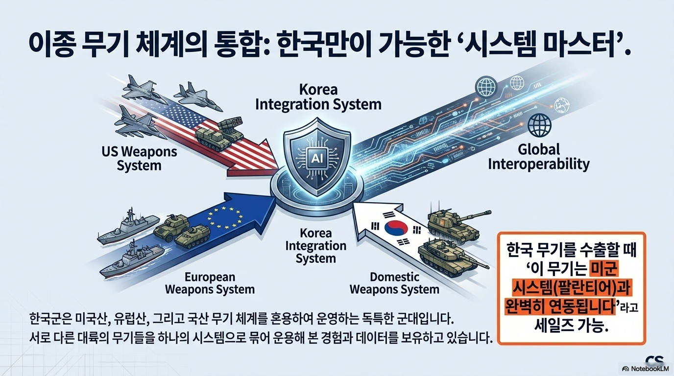 • 상호운용성(Interoperability)의 극치: 한국은 미국산, 유럽산, 그리고 국산(K-방산) 무기 체계가 한 전장에 섞여 있는 독특한 국가입니다. 서로 다른 국가, 서로 다른 철학으로 만들어진 무기들 사이의 **데이터 격차(Data Silo)**를 극복하고 하나로 묶어내는 '상호운용성'을 실증하기에 한국만큼 완벽한 환경은 없습니다.
