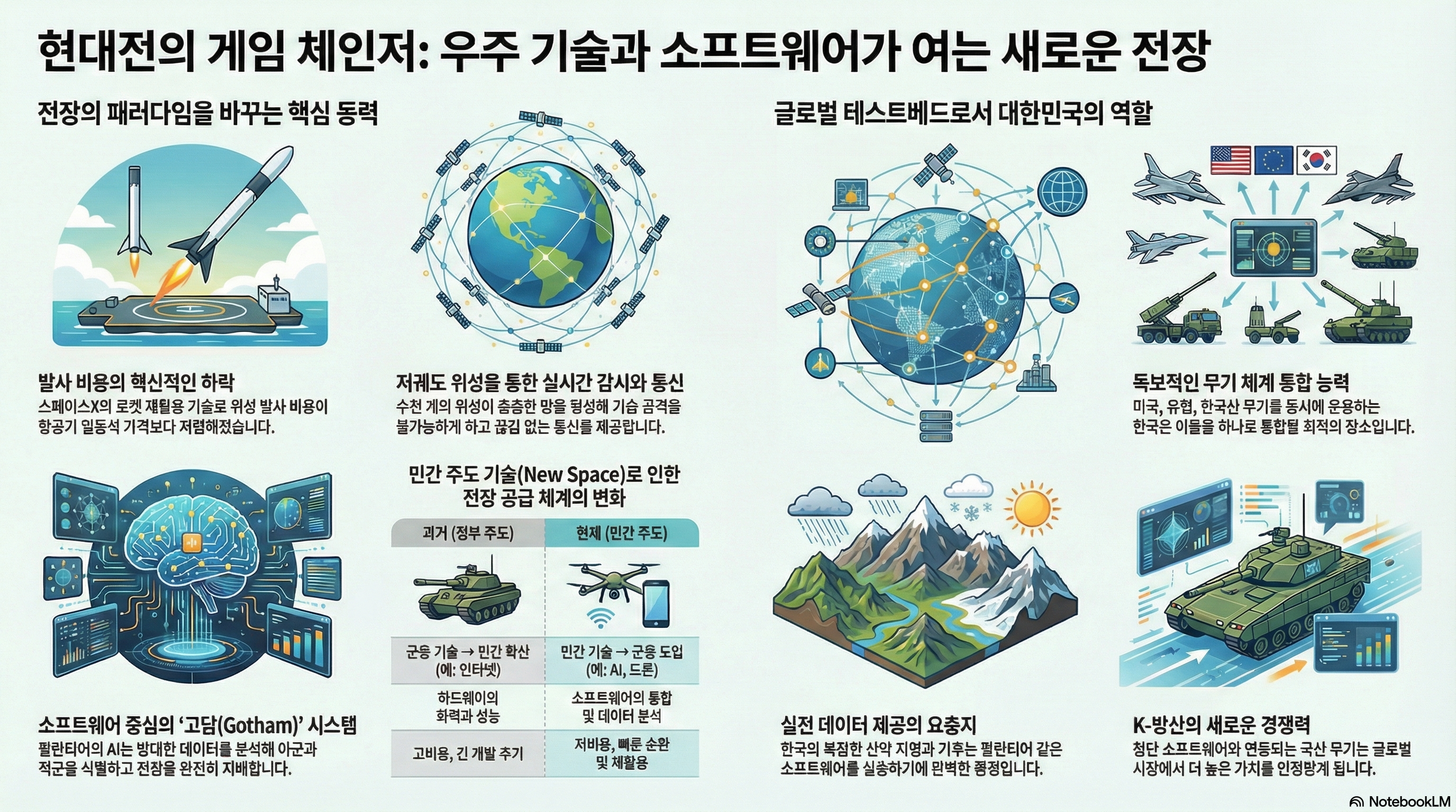 하드웨어를 넘어 소프트웨어와 우주 인프라가 승패를 결정짓는 새로운 시대, 대한민국은 단순한 무기 수출국을 넘어 전 세계 전장의 '운영 체계'를 주도하는 주인공이 될 수 있을까요? 지금이 바로 그 골든타임입니다.