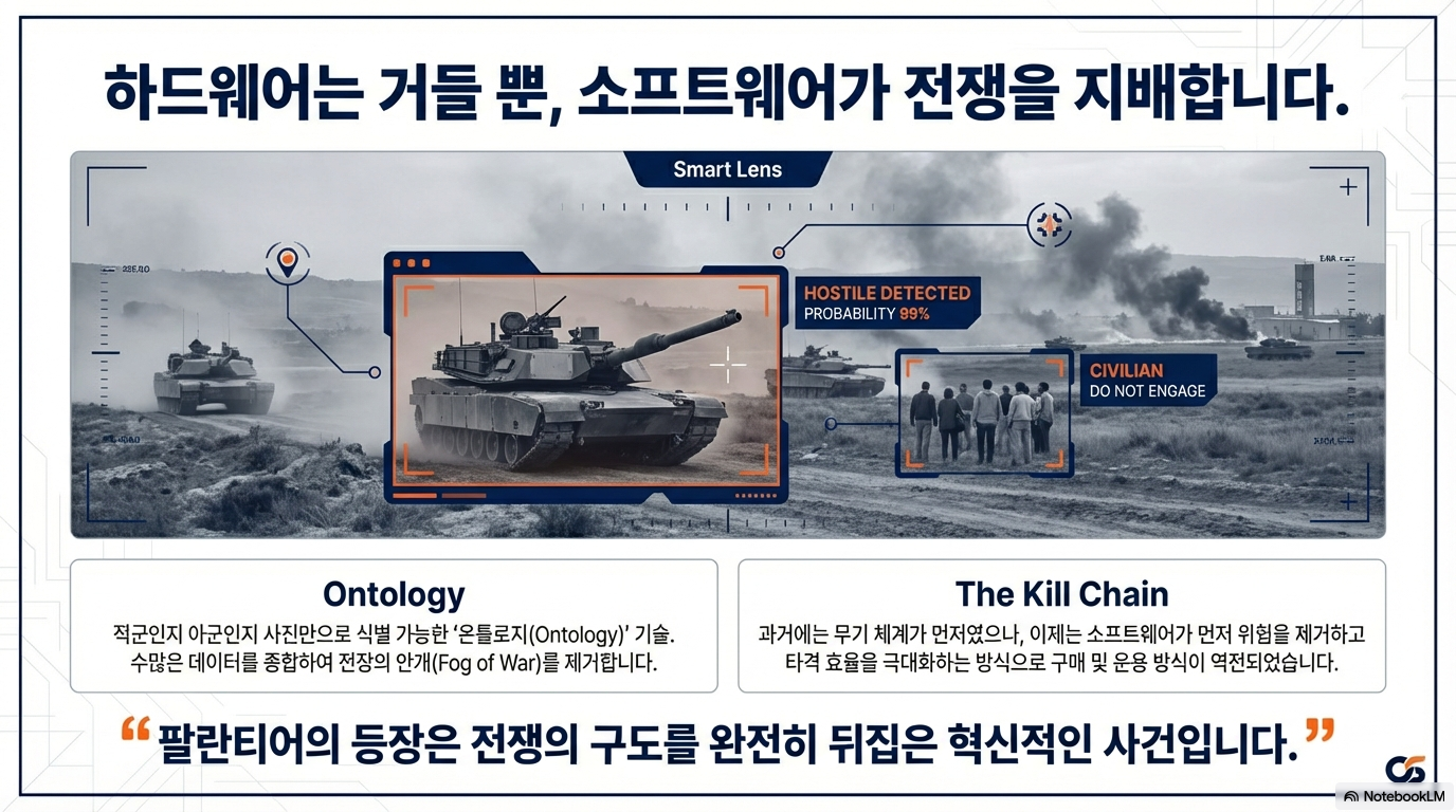 전장의 패러다임이 하드웨어에서 소프트웨어로 이동하면서, 팔란티어의 '고담(Gotham)'은 현대전의 운영체제(OS)로 자리매김했습니다.