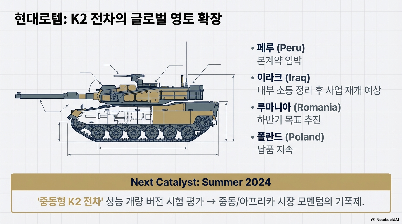 • 현대로템: 루마니아 전차 수주 가시화 및 올여름 '중동형 K2 전차' 성능 개량 시험 평가 통과 기대감.