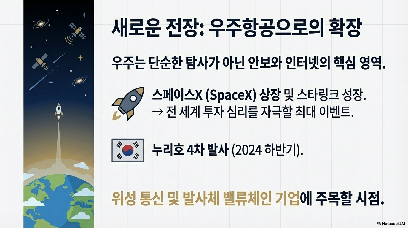 방산주는 이제 '우주 항공주'로의 밸류에이션 확장을 준비하고 있습니다. 올해 예정된 스페이스X의 상장 이슈와 스타링크의 폭발적 성장은 국내 우주 산업 생태계에 강력한 동력을 제공합니다.