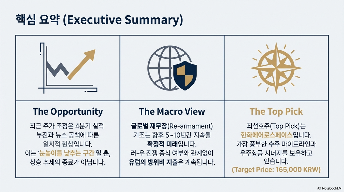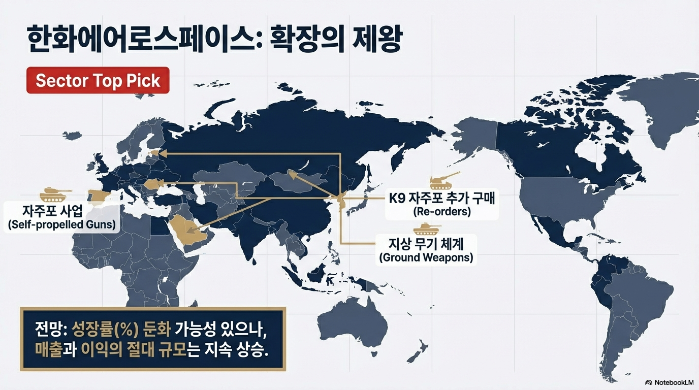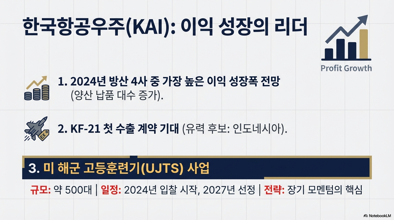 종목별 접근 전략은 더욱 정교해져야 합니다. 현재 섹터 대장주인 한화에어로스페이스가 굳건한 가운데, 이익 성장폭 측면에서는 **한국항공우주(KAI)**의 기저 효과에 주목할 필요가 있습니다.
