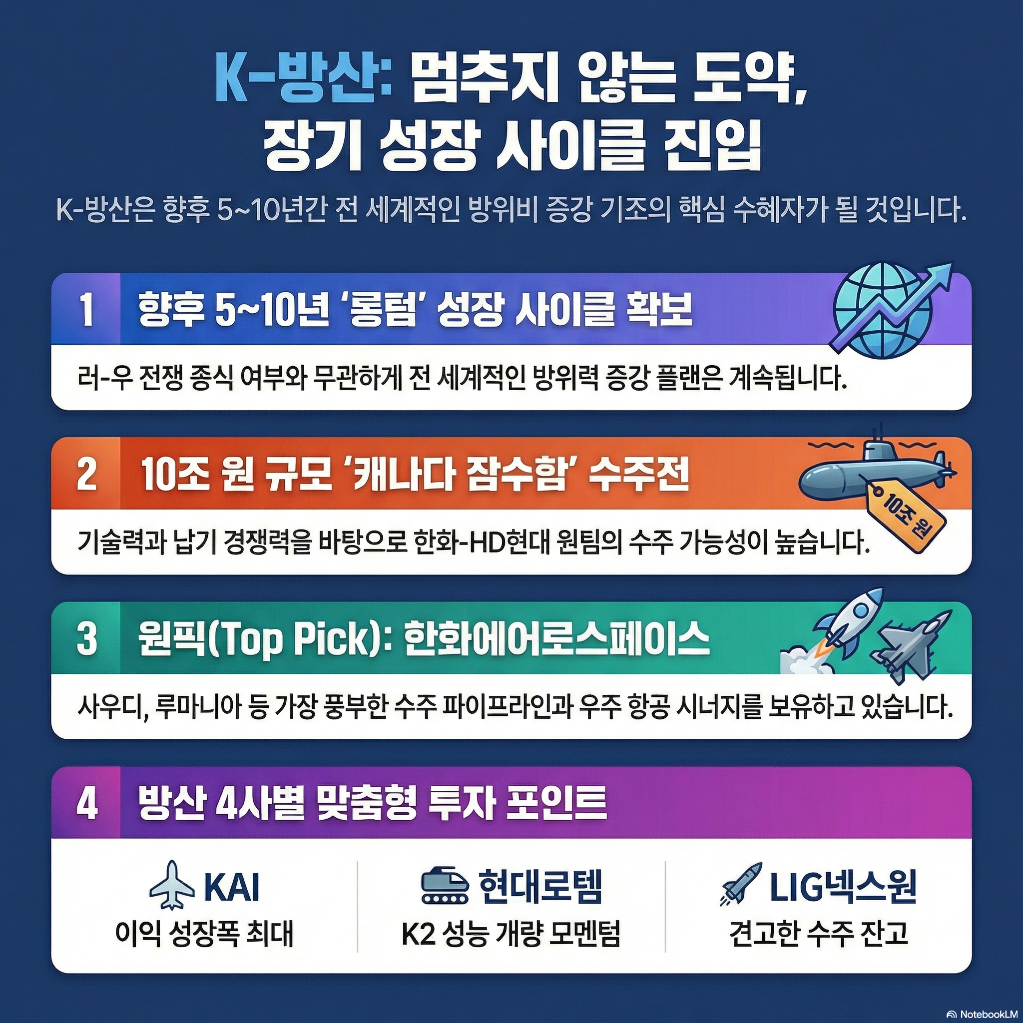 단기적인 주가 등락에 일희일비하기보다, **"5년 뒤 글로벌 시장의 패러다임을 바꿀 K-방산의 포트폴리오를 지금 이 조정기에 어떻게 선점할 것인가?"**를 고민해야 할 시점입니다. 대세 상승의 사이클은 이제 막 본궤도에 올랐습니다.