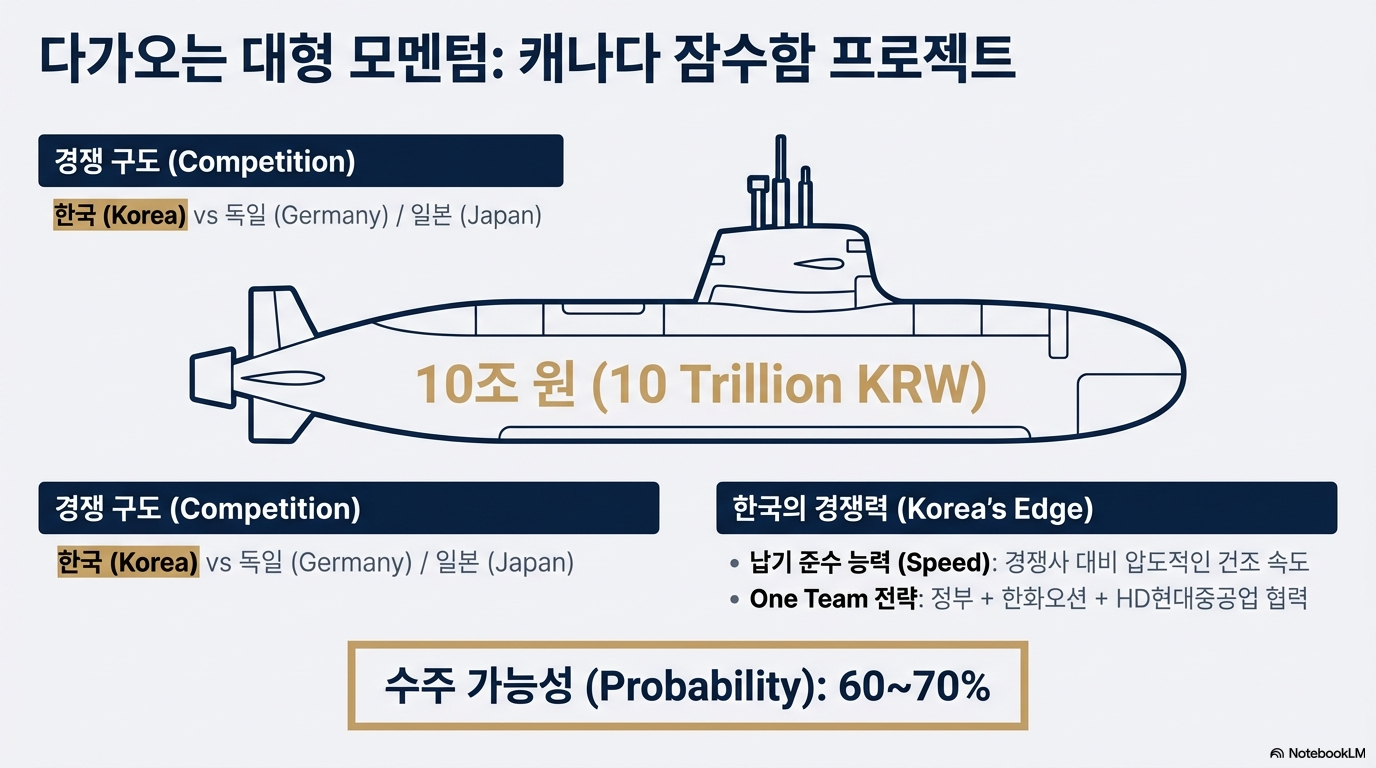 약 10조 원 규모의 캐나다 잠수함 도입 사업은 올해 K-방산의 가장 강력한 트리거입니다. 이번 프로젝트에서 주목할 포인트는 단순한 수주 가능성을 넘어선 산업 생태계의 결집입니다.