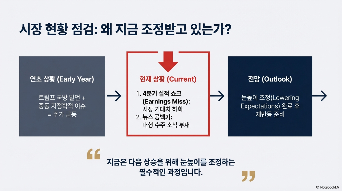 최근 K-방산 섹터의 주가가 고점 대비 조정을 받으면서 투자자들 사이에서 우려의 목소리가 나오고 있습니다. 4분기 실적이 시장 기대치를 하회하는 '어닝 쇼크' 성격을 띠면서, 일각에서는 "러시아-우크라이나 전쟁이 끝나면 방산주의 시대도 끝나는 것 아니냐"는 회의론을 제기합니다. 하지만 이는 산업의 본질을 간과한 단기적 시각입니다. 현재의 흐름은 과열된 눈높이를 낮추는 건전한 '기간 조정'에 가까우며, 오히려 향후 5년을 관통할 대호황 사이클의 진입로입니다. 전문 투자 전략가의 관점에서 지금의 시장 상황을 왜 새로운 기점으로 삼아야 하는지 그 핵심 근거를 분석합니다.