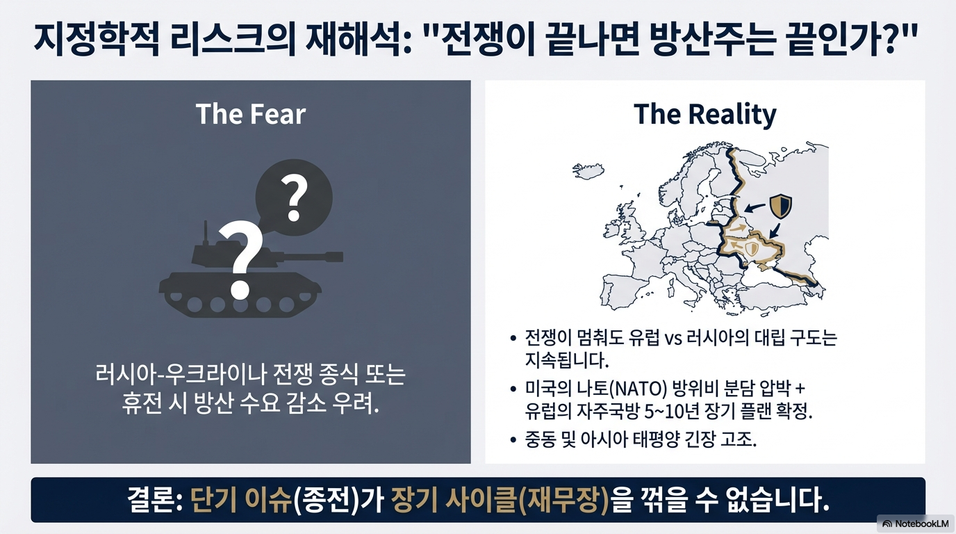 시장에는 전쟁 종식이 수주 절벽으로 이어질 것이라는 심리적 공포가 존재합니다. 그러나 실질적인 지정학적 역학 관계를 분석하면 결론은 정반대입니다. 설령 휴전이나 종전이 이루어지더라도 유럽과 러시아의 대립 구도는 고착화되었으며, 특히 나토(NATO) 내에서 미국의 역할 변화 가능성은 유럽 국가들로 하여금 '미국 의존'에서 '자체 국방력 강화'로의 구조적 전환을 강요하고 있습니다.
