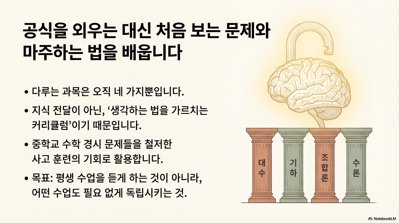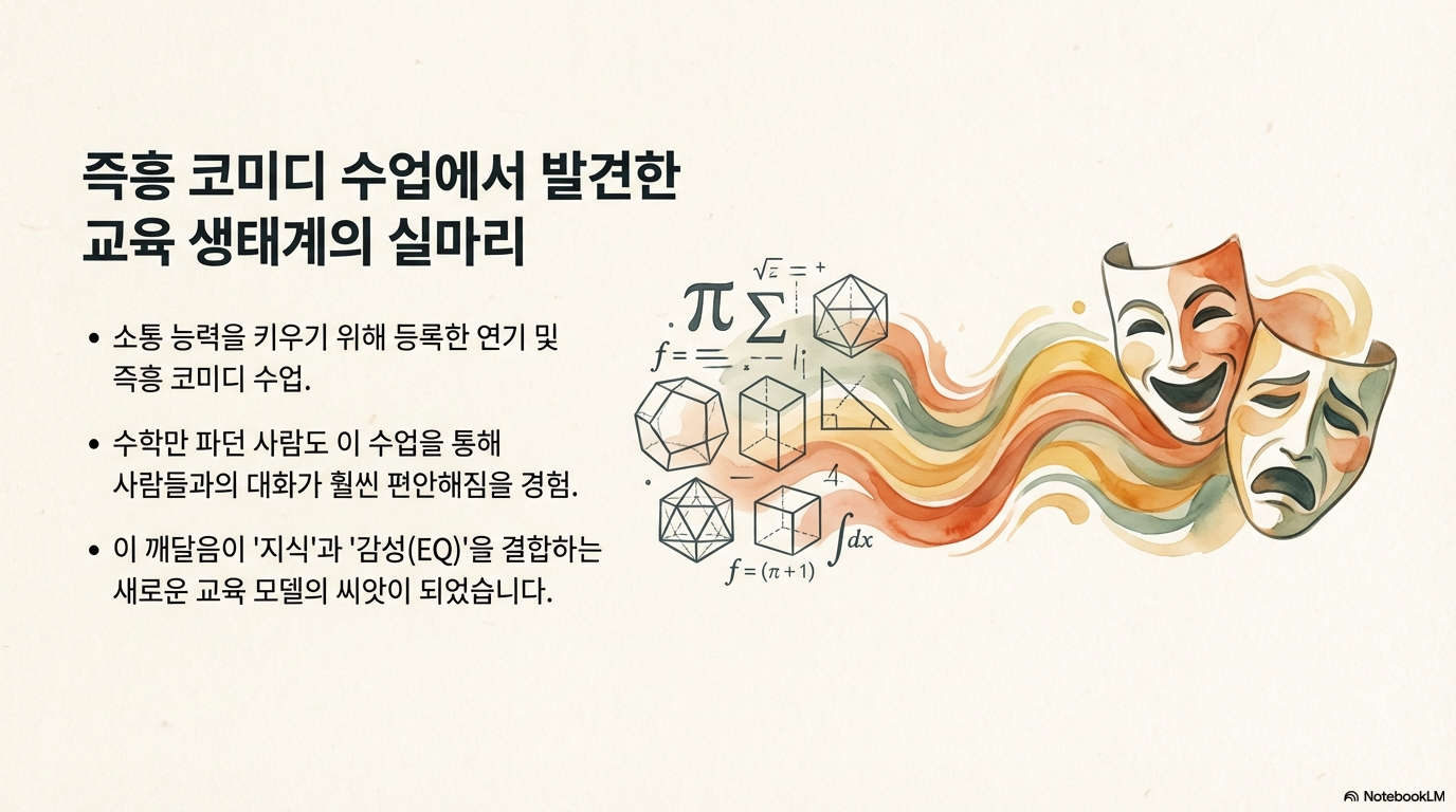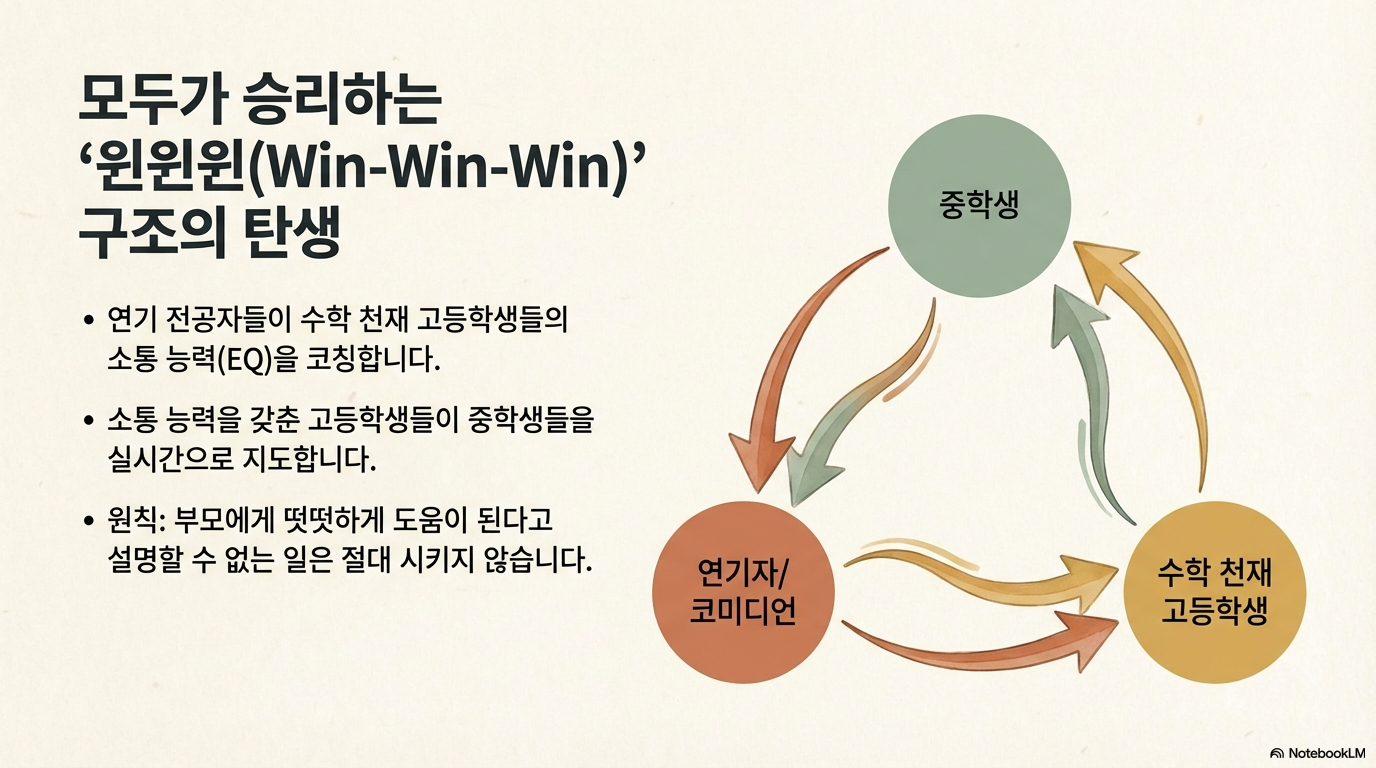 로 교수는 남을 이기는 것만을 목표로 하는 기존 교육의 한계를 넘어서고자 합니다. 그는 서로의 결핍을 채워주는 **'Win-Win-Win 생태계'**를 대안으로 제시합니다. 그가 설계한 라이브 교육 모델은 수학 천재(고등학생)와 전문 연기자, 그리고 중학생을 유기적으로 연결합니다.