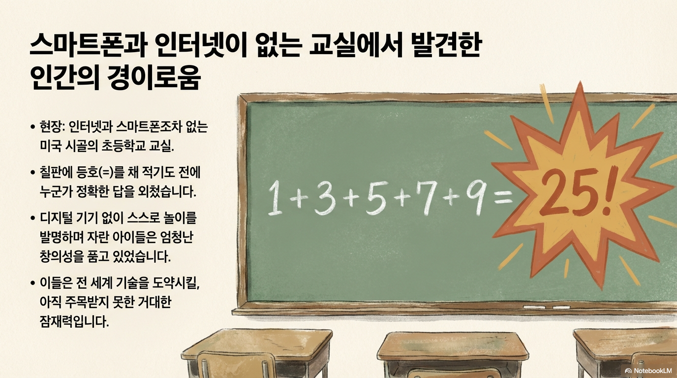 그가 미국 시골의 한 소외된 학교에서 겪은 에피소드는 큰 울림을 줍니다. 칠판에 1+3+5+7+9를 적자마자 한 4학년 아이가 "25!"라고 외쳤습니다. 휴대폰도, 인터넷도 없는 열악한 환경이었지만, 아이들은 스스로 놀이를 만들어내며 사고하는 즐거움을 이미 몸소 실천하고 있었던 것이죠. 환경보다 중요한 것은 '생각하는 즐거움'을 깨닫는 것입니다. 현장에 뛰어들어 인간의 삶을 깊이 이해할 때, 비로소 우리는 AI가 절대 풀 수 없는 가치 있는 질문을 던질 수 있습니다.