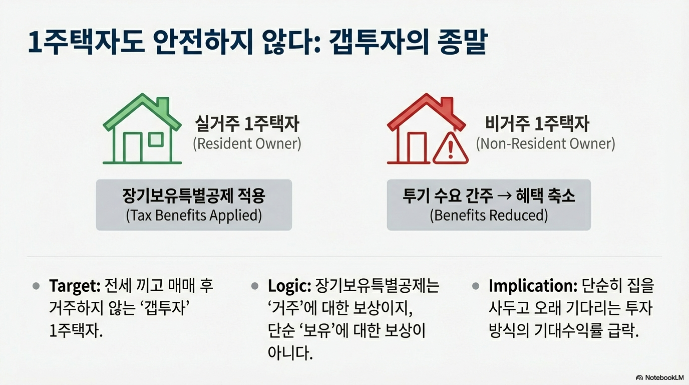 바로 이 지점에서 정부의 두 번째 수가 등장합니다. '1주택자는 실수요자'라는 오랜 통념을 깨는, 놀랍고도 치밀한 반격입니다. 정부의 새로운 정책 방향은 1주택자 중에서도 실제 거주하는 사람과, 전월세를 주고 다른 곳에 살며 투자 목적으로 집을 보유한 사람을 명확히 구분하여 과세하겠다는 것입니다.
