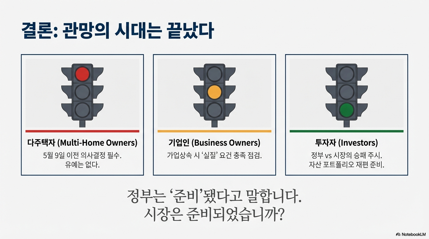 정부의 부동산 정책 발표는 늘 있어왔지만, 이번은 다릅니다. 정부는 오는 5월 9일을 기점으로 다주택자에 대한 양도소득세 중과 유예 조치를 더는 연장하지 않겠다고 못 박았습니다. 이는 과거의 정책들과는 차원이 다른, 그야말로 '결정적인 순간'으로 평가받고 있습니다.