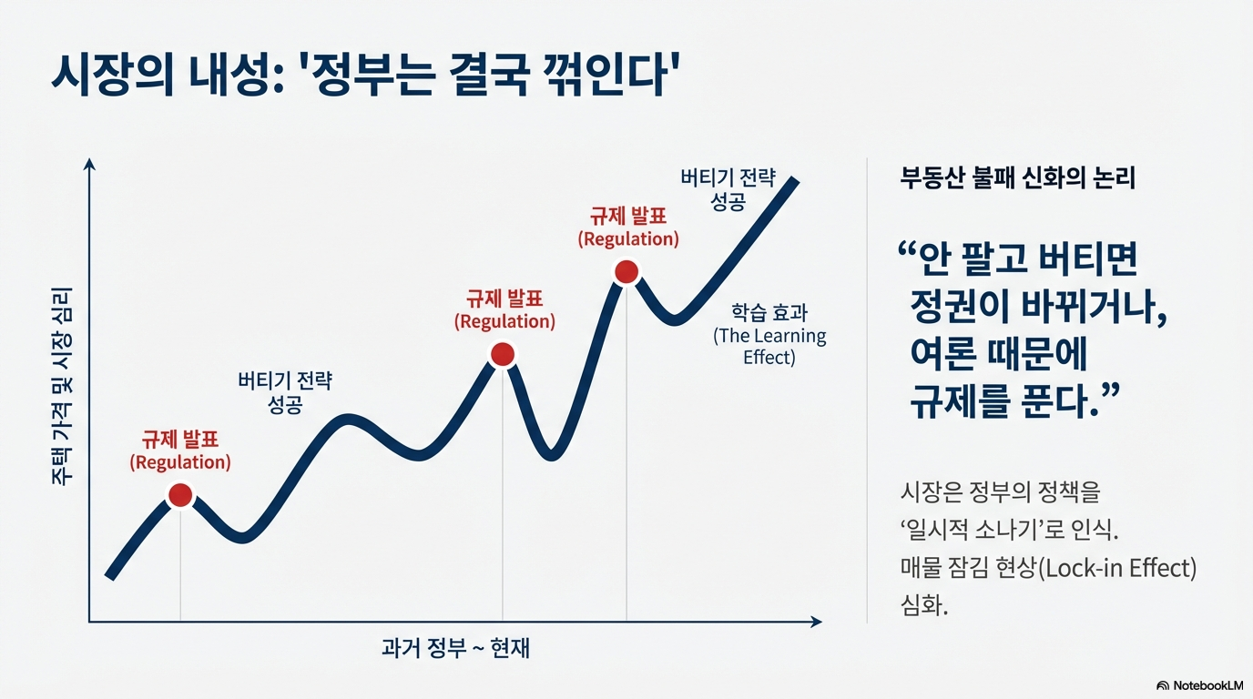 과거 정부가 비슷한 카드를 꺼낼 때마다 시장은 '버티기'로 응수했습니다. '정권이 바뀌거나 경기가 어려워지면 어차피 유예해줄 것'이라는 학습된 믿음, 즉 '부동산 불패 신화는 실증적으로 증명됐다'는 확신이 있었기 때문입니다. 이런 버티기는 매물 잠김 현상으로 이어졌고, 결국 가격 상승을 부추기는 악순환을 낳았습니다.