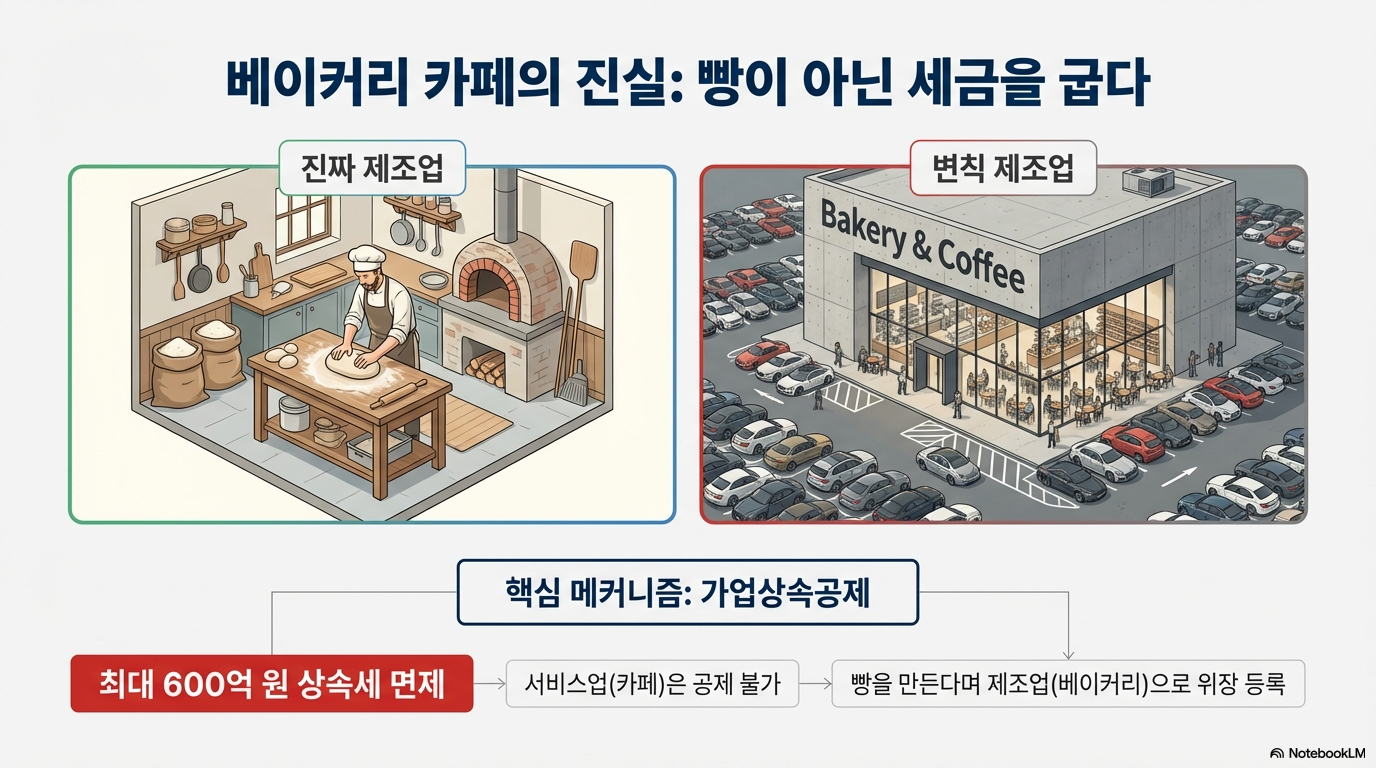 비밀은 '가업 상속 공제' 제도에 있습니다. 본래 중소기업의 승계를 돕기 위한 좋은 취지의 이 제도는 공제 한도가 최대 600억 원까지 늘어나면서, 일부 부유층에게는 세금 없는 부의 대물림 통로로 악용되기 시작했습니다. 핵심은 '빵을 직접 제조'하는 행위를 통해 이 사업을 단순 서비스업이 아닌 '제조업'이나 '음식점업'으로 인정받는 것입니다. 바로 이 분류가 수백억 원의 상속세를 면제받는 마법의 열쇠가 됩니다.