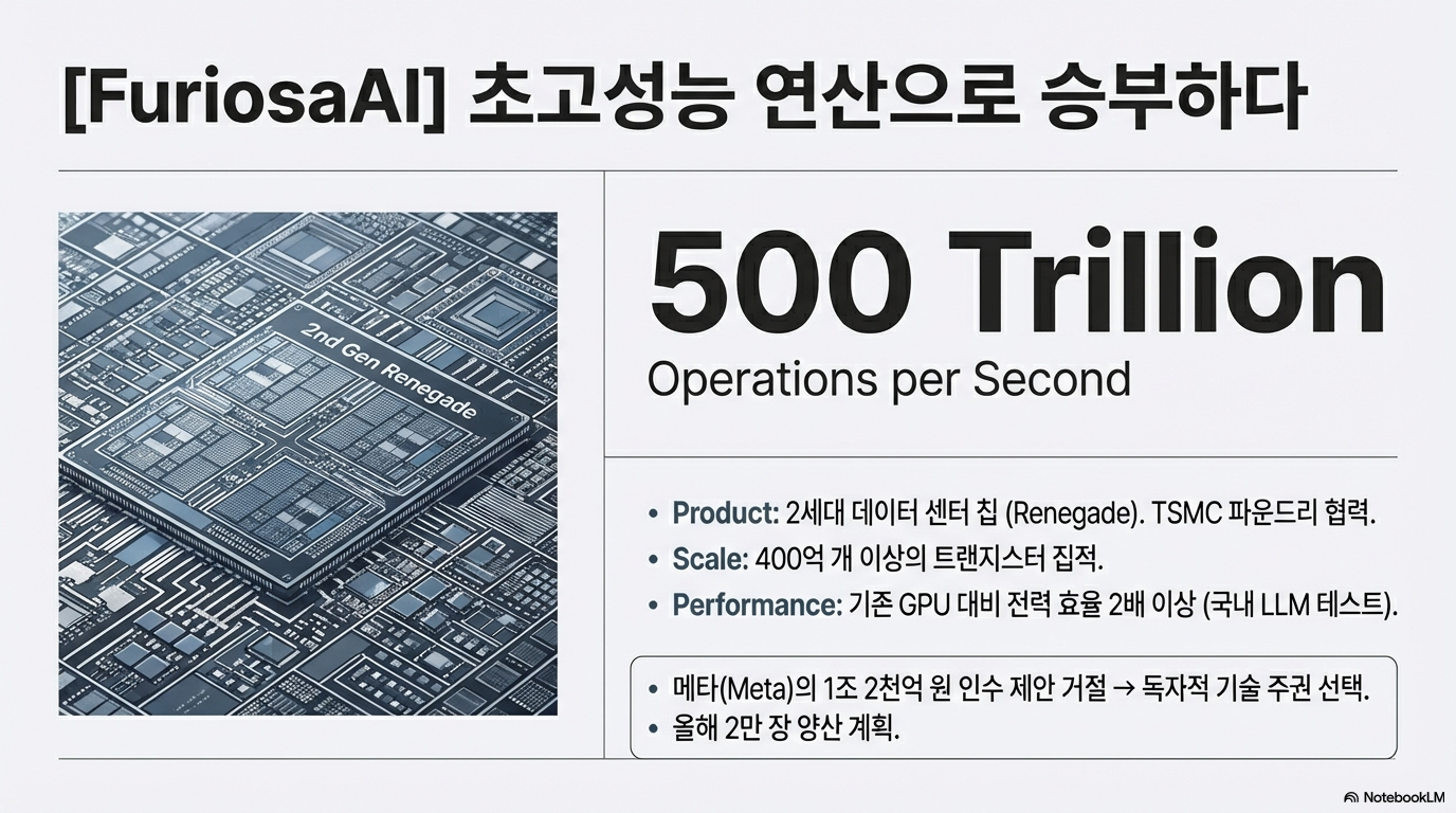 • 퓨리오사AI: 초당 500조 회 이상의 연산을 수행하는 2세대 칩 '레니게이드'를 개발했습니다. 국내 대기업의 거대언어모델(LLM) 테스트 결과 기존 GPU보다 2배 이상의 전력 효율을 입증했습니다. 특히 이 기업은 인공지능이 주목받기 전부터 쌓아온 기술력을 인정받아, 과거 메타(Facebook)로부터 제안받은 1.2조 원 규모의 인수 제안을 거절하고 독자 노선을 택했을 만큼 글로벌 시장에서도 이미 그 가치를 입증받았습니다.