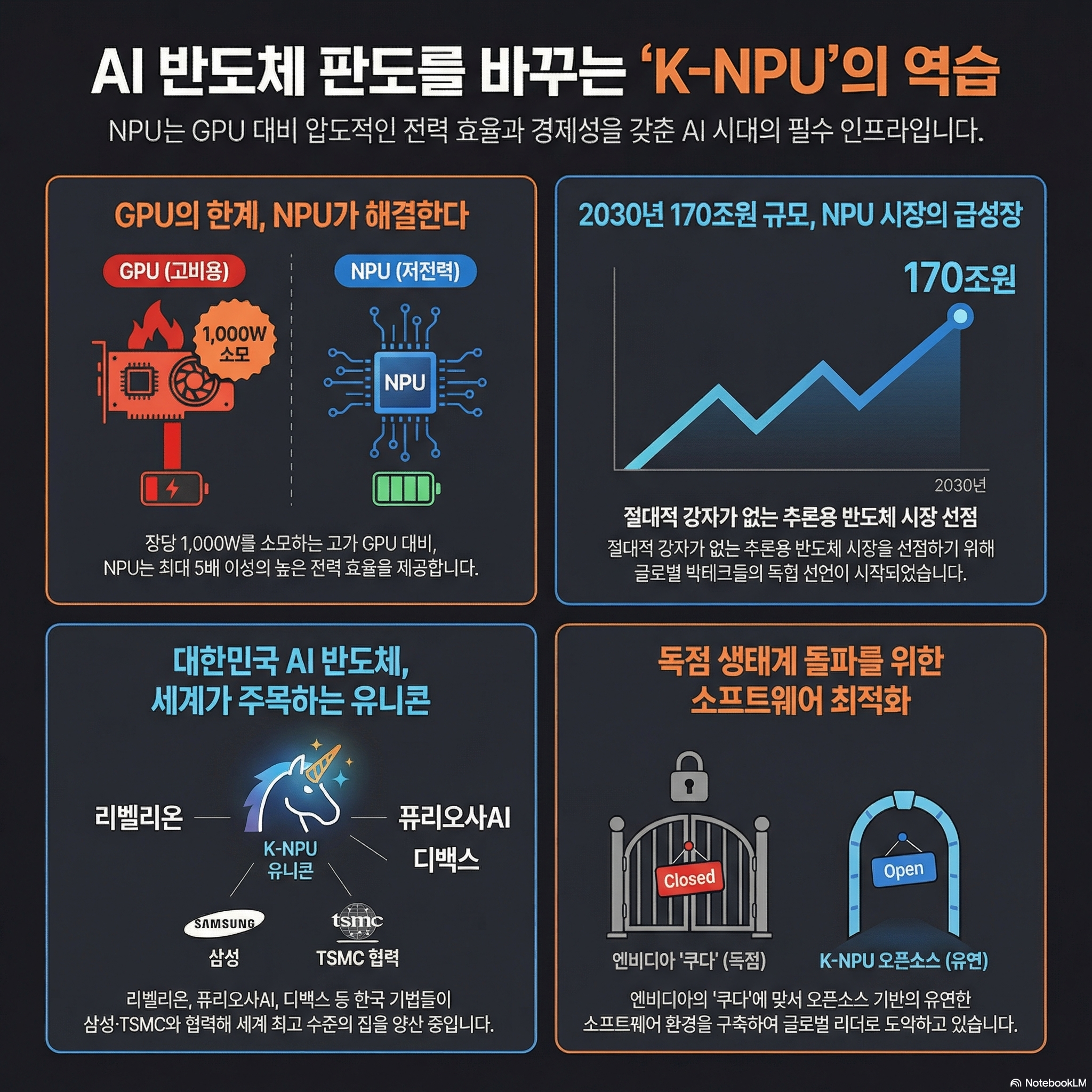 이해를 돕기 위해 비유하자면, 모든 짐을 다 실을 수 있지만 엄청난 기름을 먹는 '대형 트럭(GPU)'의 시대에서, 목적지까지 빠르고 가볍게 배달하는 '전기 오토바이(NPU)'의 시대로 패러다임이 이동하고 있는 것입니다.