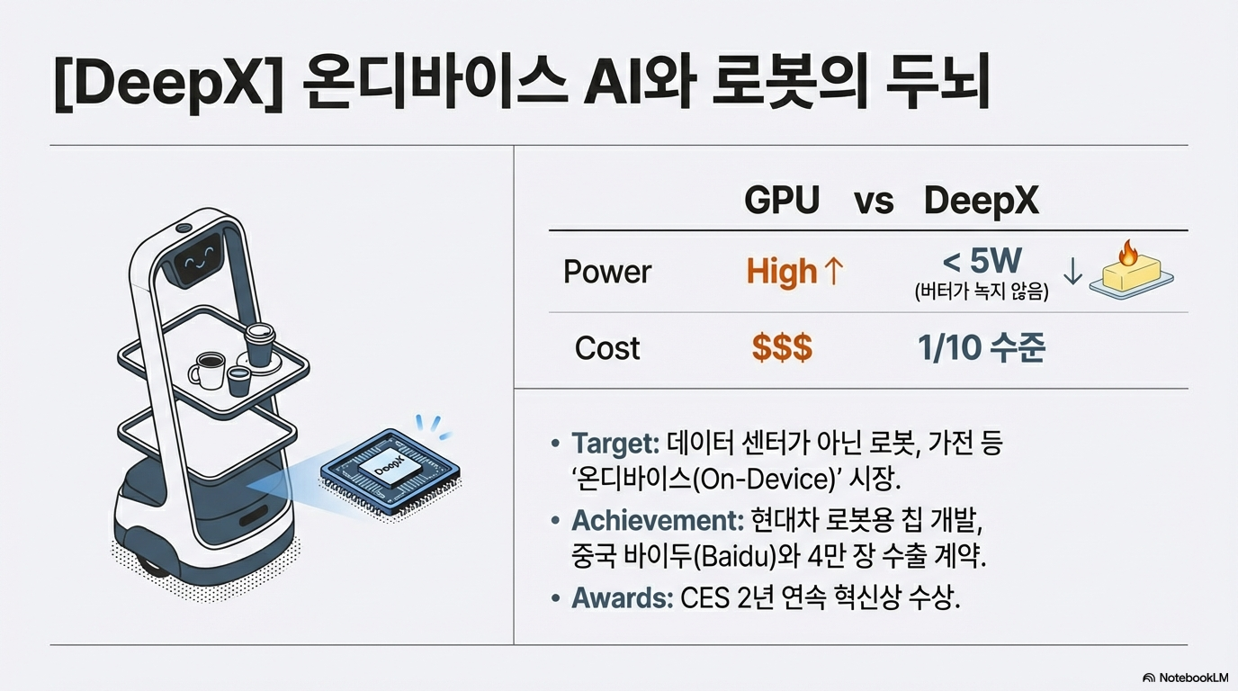 국내 기업 **디백스(DEEPX)**는 이 분야에서 전설적인 '버터 테스트' 일화를 남겼습니다. 여러 AI 반도체 위에 버터를 올리고 구동했을 때, 타사 칩들은 발열을 견디지 못하고 버터를 녹여버렸지만, 극강의 저전력 설계를 구현한 디백스의 칩만은 차가운 상태를 유지하며 버터를 녹이지 않았습니다. 이는 열 설계 전력(TDP) 제어 능력을 시각적으로 증명한 사건이었습니다.