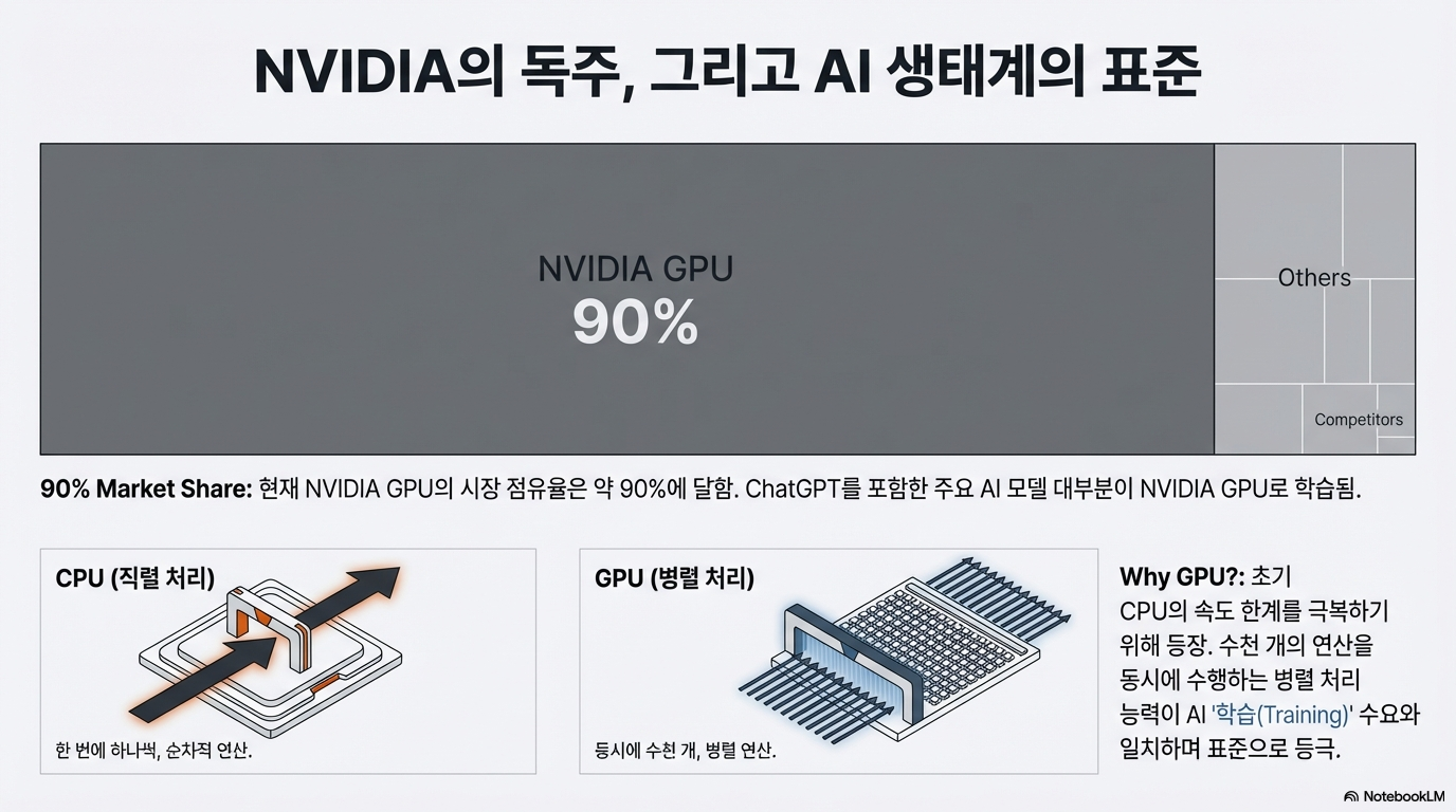 현재 글로벌 AI 생태계를 지배하는 표준은 엔비디아의 GPU(그래픽 처리 장치)입니다. 수천 개의 연산을 동시에 처리하는 GPU는 AI 학습의 최강자로 군림하며 시장의 90%를 장악했습니다. 그러나 이 화려한 성능의 대가는 가혹합니다. 엔비디아 GPU는 이제 '전력 괴물'이라 불릴 만큼 막대한 에너지를 소모하며, 이를 감당해야 하는 빅테크 기업들에 감당하기 힘든 운영 부담을 안겨주고 있습니다.
