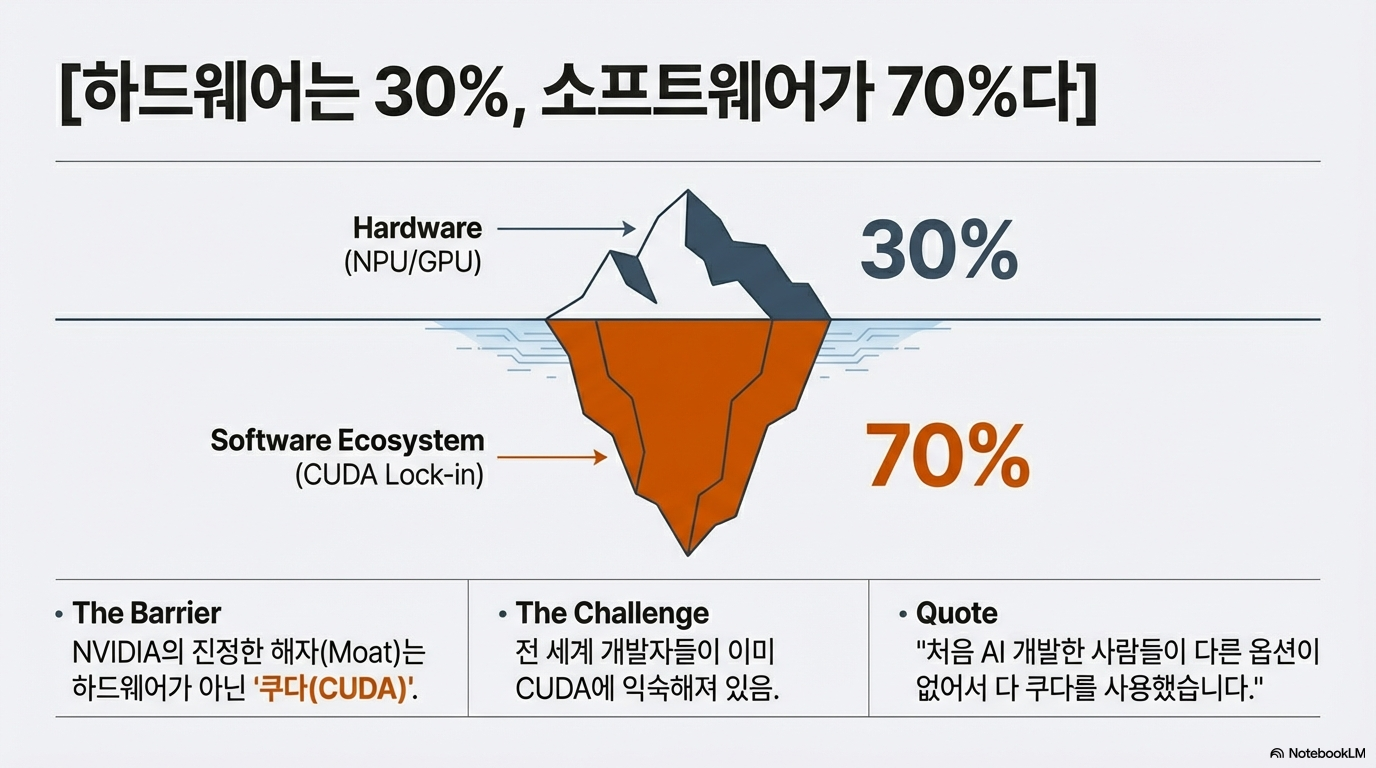 한국 반도체가 글로벌 시장을 장악하기 위해 넘어야 할 '최종 보스'는 엔비디아의 소프트웨어 생태계인 '쿠다(CUDA)'입니다. 전 세계 개발자들이 이미 쿠다에 종속된 상황에서, 하드웨어 성능만으로는 이 견고한 성벽을 허물 수 없습니다.