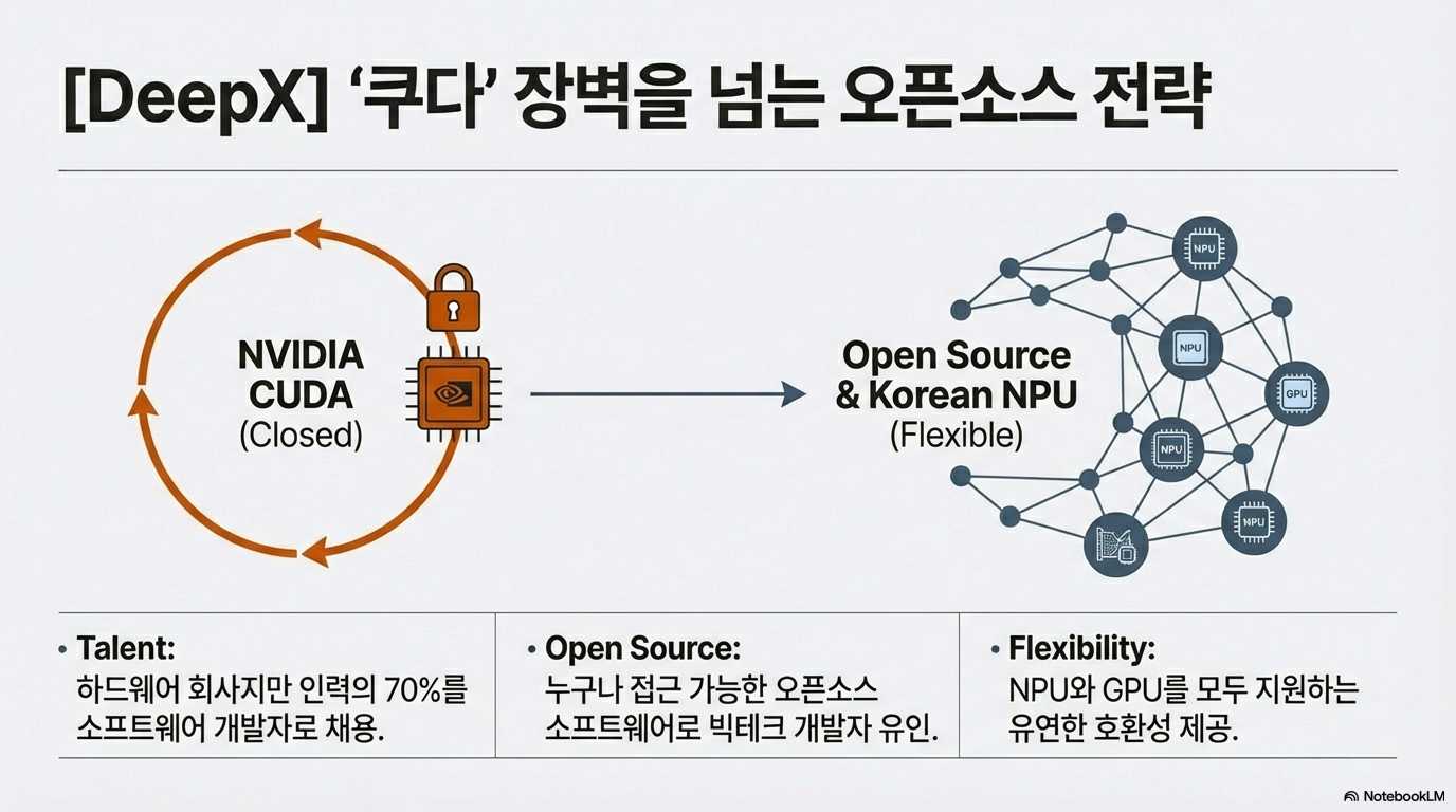 이를 간파한 한국 기업들은 전략적인 변화를 꾀하고 있습니다. 하드웨어 기업임에도 전체 인력의 약 70%를 소프트웨어 개발자로 채용하는 파격적인 행보가 대표적입니다. 개발자들이 특정 플랫폼에 갇히지 않도록 오픈소스 기반의 유연한 개발 환경을 구축함으로써, 기존 쿠다 생태계에서 국산 NPU로 넘어오는 '전환 비용'을 획기적으로 낮추고 있는 것입니다.