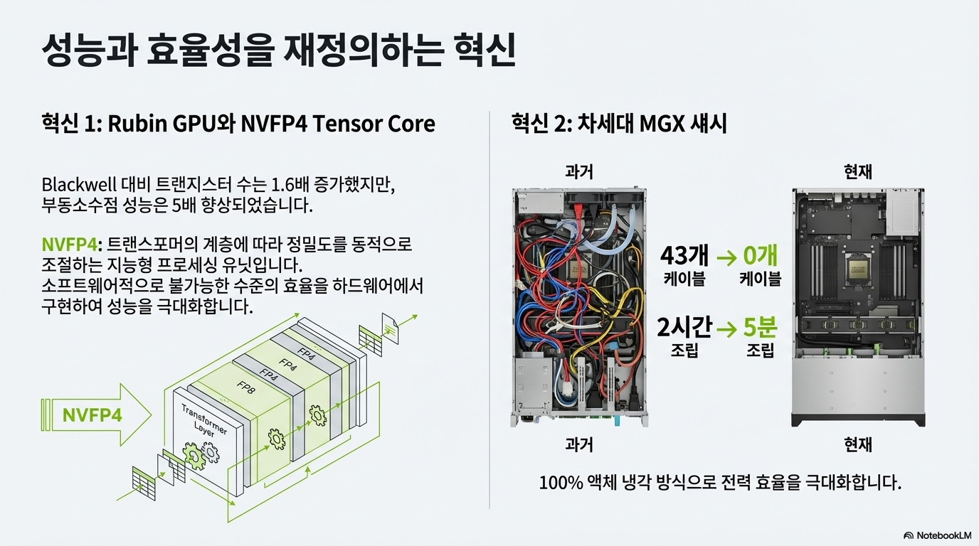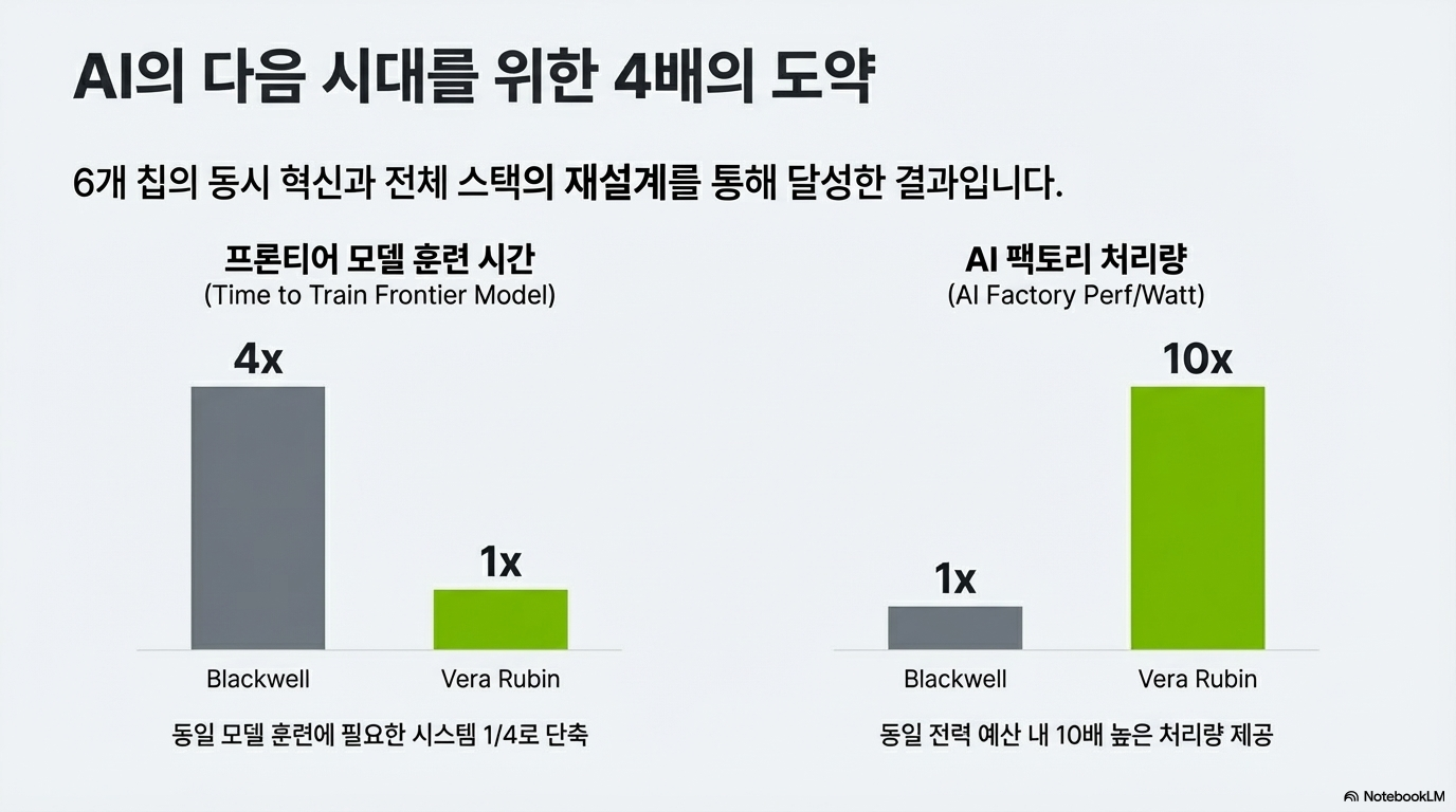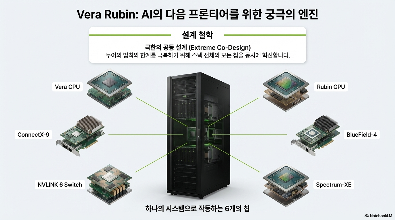 젠슨 황이 제시한 해답은 **'극단적 공동 설계(extreme co-design)'**입니다. 필요한 성능 도약을 이루기 위해, NVIDIA는 "새로운 세대에서는 한두 개 이상의 칩을 바꾸지 않는다"는 자신들의 내부 규칙마저 깨고, Vera Rubin 플랫폼을 위해 무려 6개의 각기 다른 칩을 동시에 재설계했습니다. Vera CPU, Rubin GPU, NVLink 스위치, 네트워킹 칩까지, 모든 부품이 처음부터 완벽하게 함께 작동하도록 설계된 것입니다.