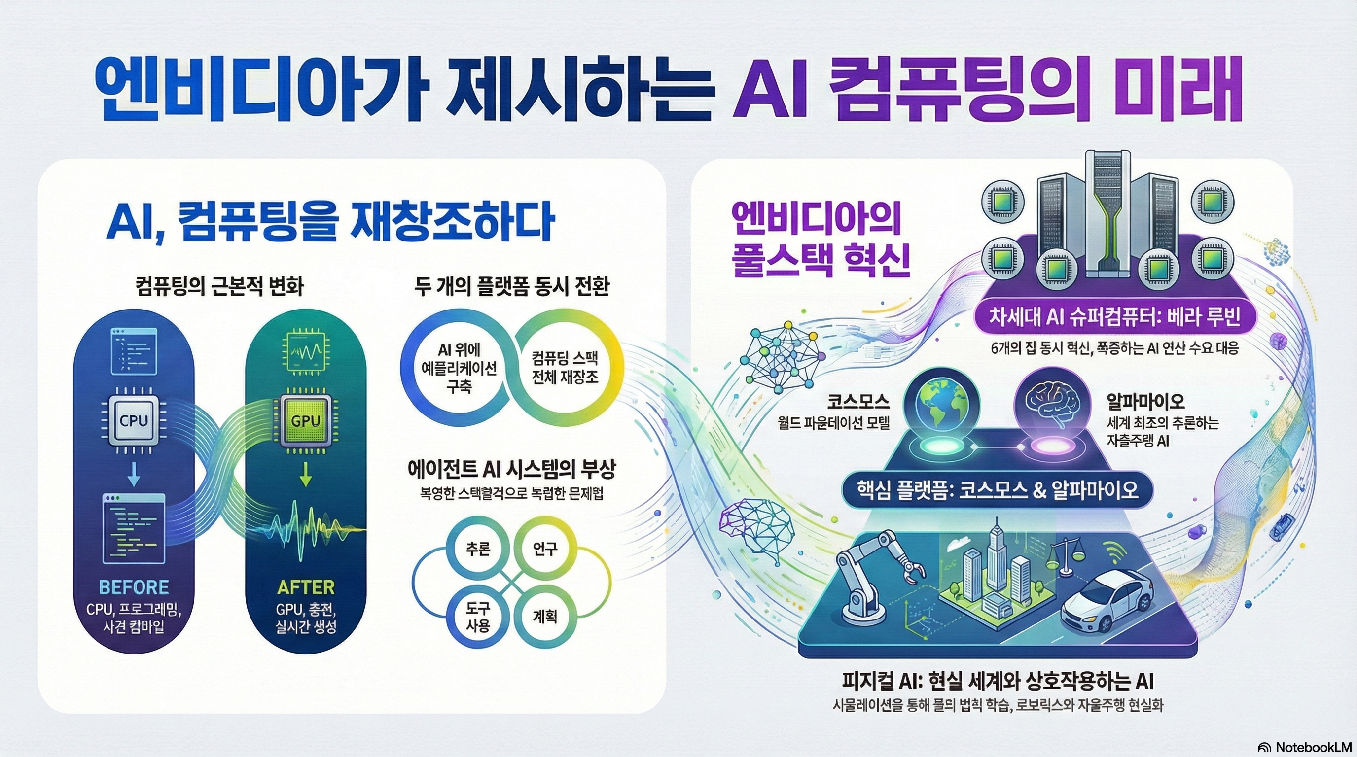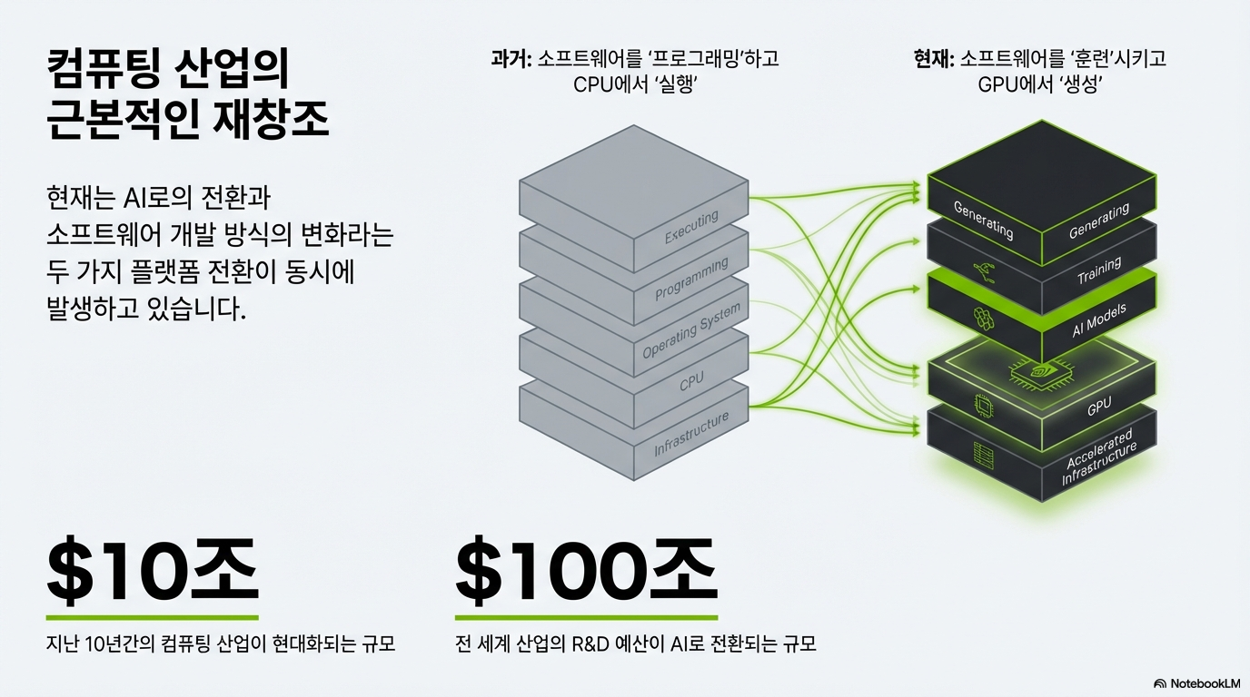 젠슨 황은 현재 컴퓨터 산업이 10~15년 주기로 겪는 단순한 플랫폼 전환이 아닌, 역사상 유례없는 '두 개의 동시적 플랫폼 전환'을 겪고 있다고 진단했습니다. 여기서 그는 대부분의 사람들이 놓치고 있는 더 큰 그림을 제시합니다.