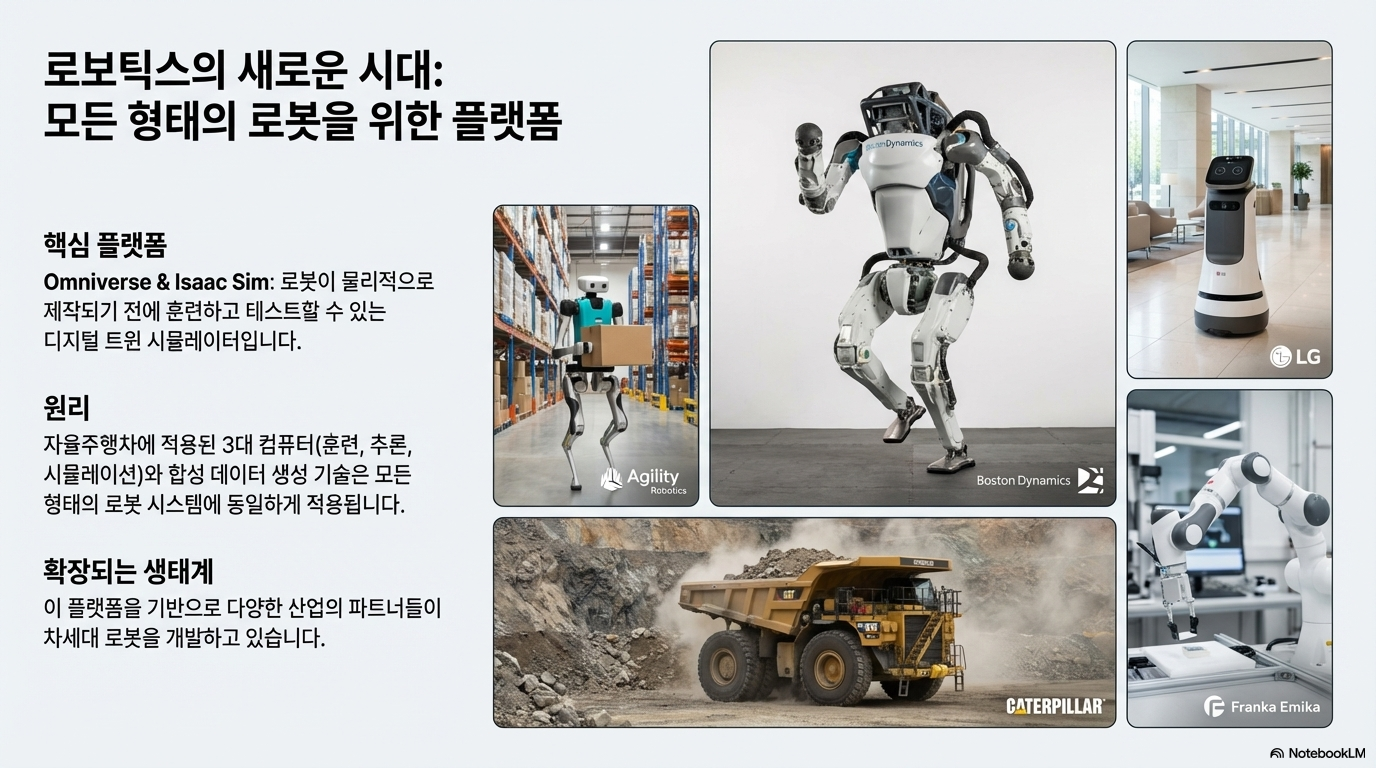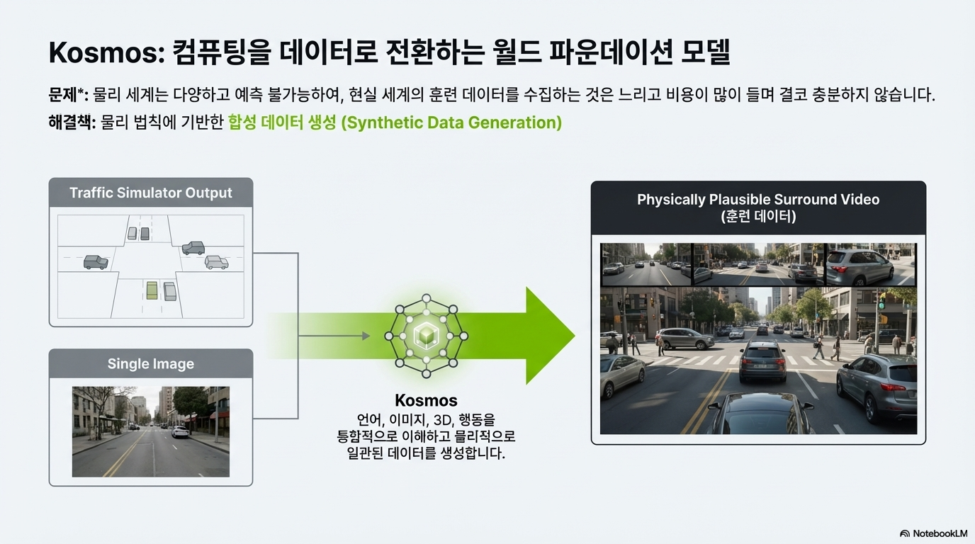 NVIDIA의 해결책은 바로 **합성 데이터 생성(synthetic data generation)**입니다. 이는 젠슨 황의 표현을 빌리자면, "컴퓨팅을 데이터로 전환하는(turns compute into data)" 혁신적인 아이디어입니다. '월드 파운데이션 모델(World Foundation Model)'인 Kosmos는 간단한 텍스트 프롬프트나 시뮬레이션만으로 물리적으로 타당하고 현실적인 영상 시나리오를 무한히 생성해낼 수 있습니다. 이제 우리는 가상 세계에서 로봇과 자율주행차를 거의 무한대에 가까운 '롱테일' 시나리오에 대해 훈련시킬 수 있습니다. 그리고 바로 이 막대한 양의 합성 데이터를 생성하고 처리하는 데 필요한 엄청난 연산 능력이, NVIDIA가 하드웨어를 근본부터 재설계해야만 했던 이유이기도 합니다.
