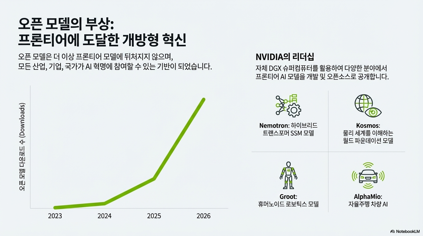 독점 기술의 대명사처럼 여겨지는 NVIDIA가 오픈 소스를 외치는 것은 언뜻 모순처럼 들릴 수 있습니다. 하지만 그 이면에는 치밀한 전략이 숨어있습니다. 젠슨 황은 키노트에서 오픈 모델의 중요성을 그 어느 때보다 강조했습니다.