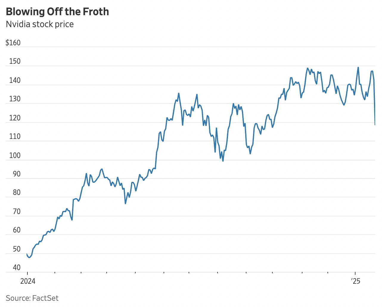 • 엔비디아(Nvidia): 주가가 17% 급락하며 5,000억 달러 이상의 가치가 증발했다. 이는 AI 모델이 더 저비용으로 운영될 수 있다는 가능성이 반영된 결과다.