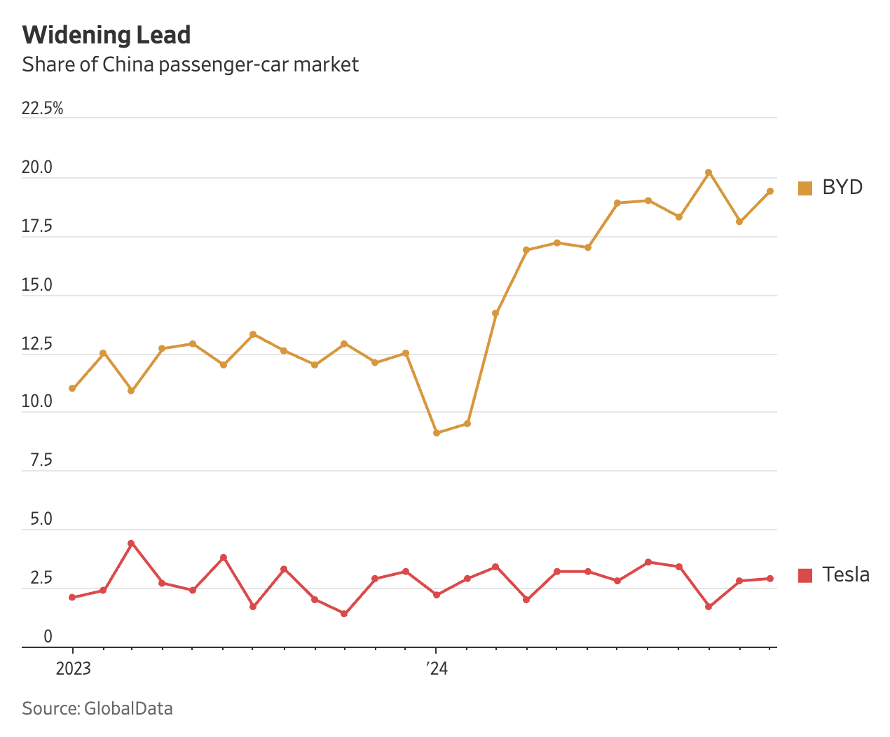 경쟁 심화로 인해 전기차의 가격 인하도 가속화되고 있다. 2024년 한 해 동안 227개 모델의 가격이 인하되었으며, 이는 2023년 148개 모델보다 크게 증가한 수치다. 테슬라는 중국에서 5년간 무이자 할부를 제공하거나 모델 Y를 3만 3천 달러 이하로 할인하며 시장 점유율을 유지하려 하고 있다.