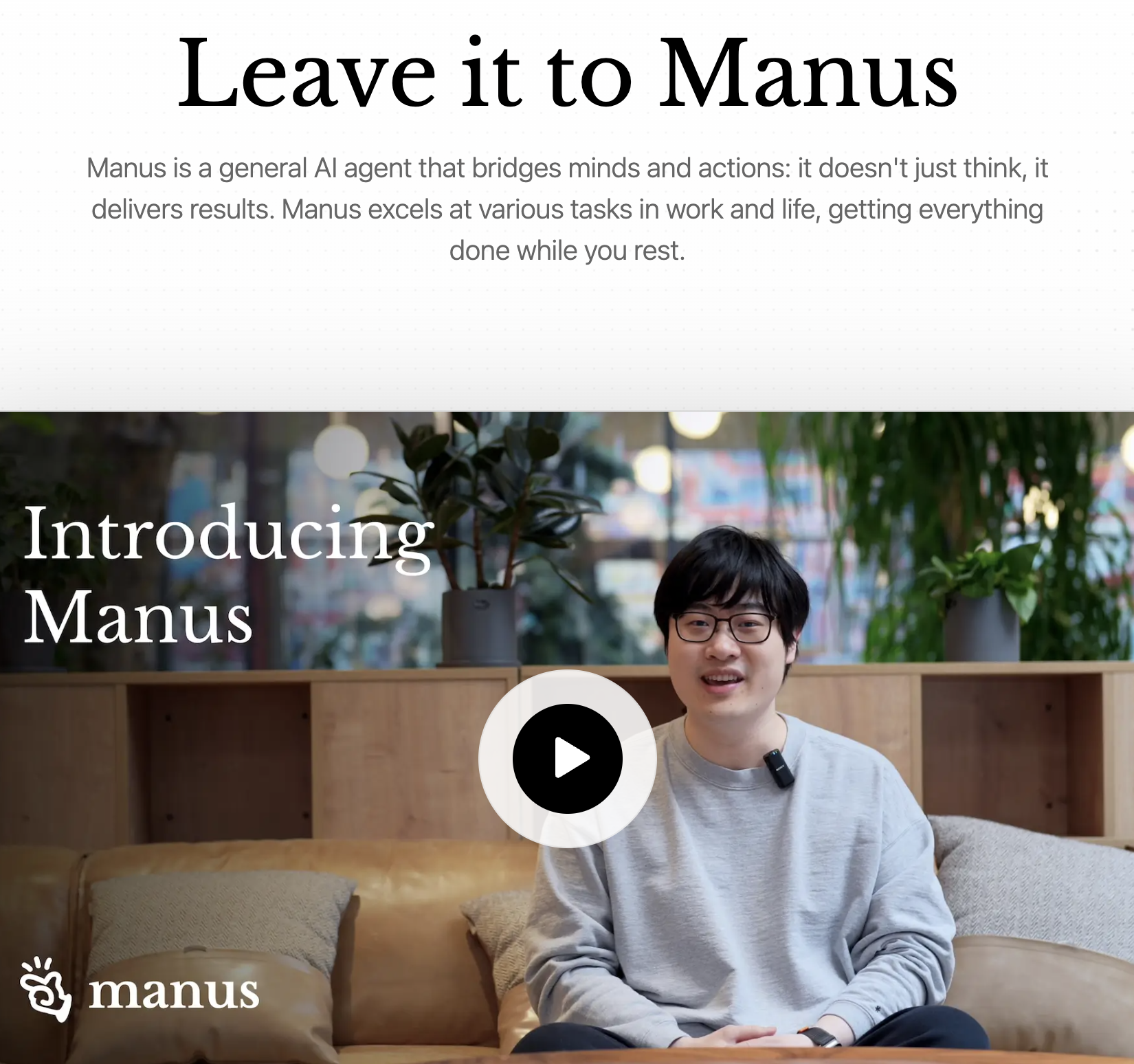Manus AI는 최근 데모 영상을 공개하며 **"세계 최초의 범용 AI 에이전트(general AI agent)"**를 선보였다. 이 AI 에이전트는 단순히 아이디어를 생성하는 것이 아니라, 이를 실행까지 가능하게 만드는 것이 특징이다.