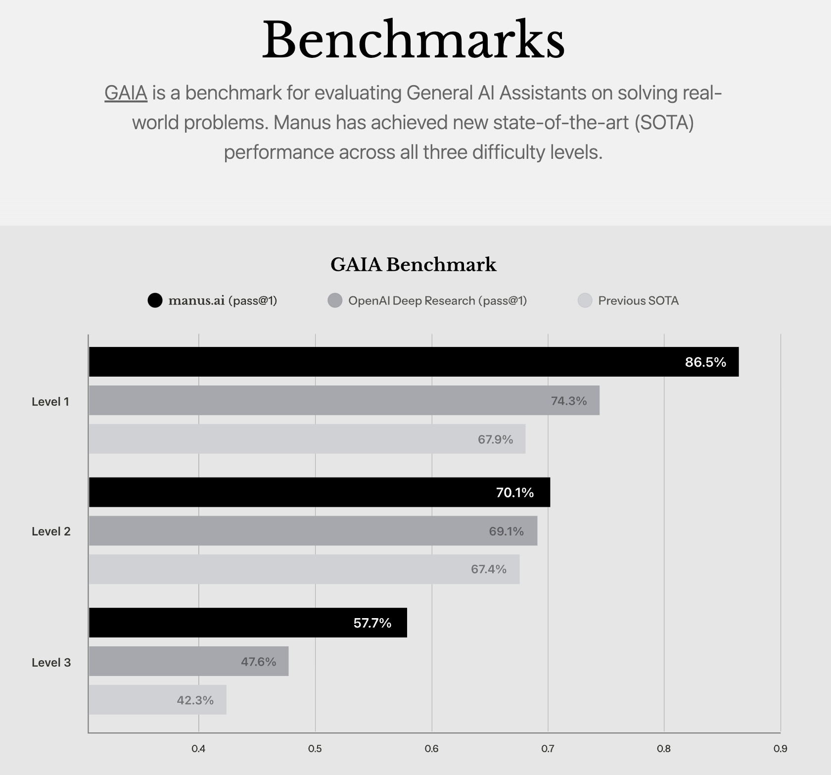 - Manus AI는 GAIA(GAI Assistant) 벤치마크에서 OpenAI 모델을 능가했다고 발표했다.