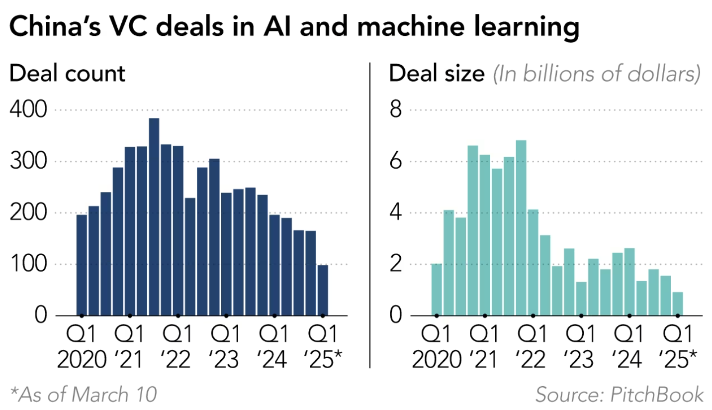 DeepSeek의 등장으로 AI 산업이 주목받았음에도 불구하고, VC 투자 심리는 여전히 위축된 상태다. PitchBook의 벤처캐피털 연구 책임자인 카일 스탠포드는 "DeepSeek이 등장했다고 해서 AI 투자 트렌드가 당장 바뀌지는 않는다"며 "중국 VC 시장 자체가 여전히 위축되어 있으며, AI 투자 금액도 2021년 최고점의 절반 이하"라고 분석했다.