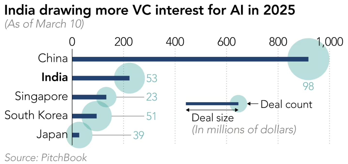 2024년 기준, 인도는 AI 및 머신러닝 분야에서 306건, 총 17억 달러 규모의 투자를 유치하며 한국(308건, 18억 달러)에 이어 3위를 기록했다. 그러나 2025년 들어서는 한국을 제치고 아시아 2위 투자 시장으로 부상했다.
