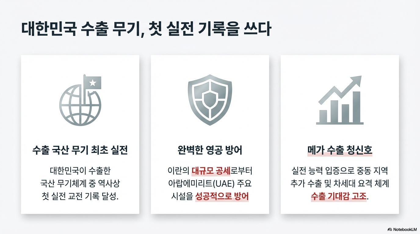 이번 교전은 단순한 방어 성공을 넘어 대한민국 방위산업 역사에 한 획을 그은 기념비적 사건입니다. 그동안 국산 무기체계는 혹독한 환경의 시험 발사장에서 우수한 성적을 거두며 기술력을 쌓아왔지만, 실제 전쟁터에서의 검증은 차원이 다른 영역이었습니다.