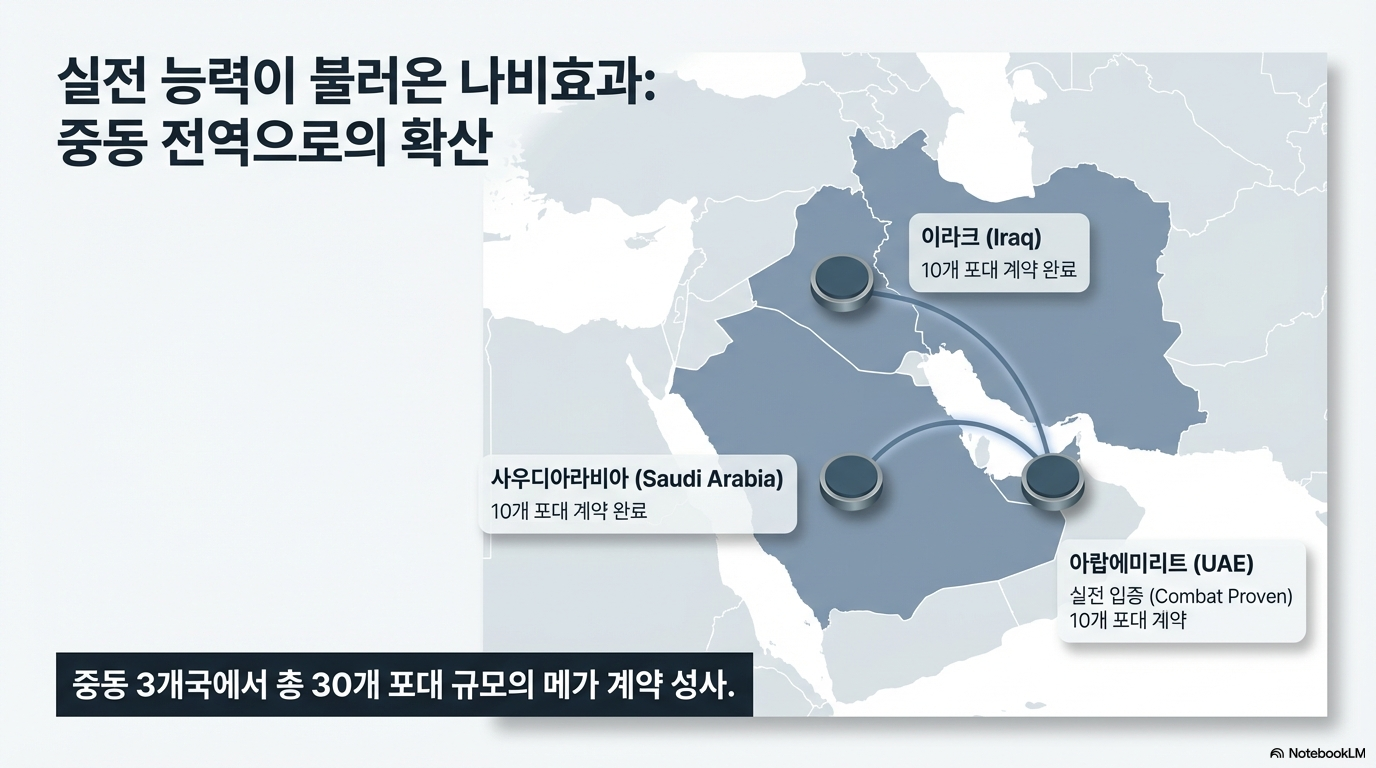 • 중동 3국으로 퍼지는 K-방산의 신뢰: UAE의 성공적인 운용 사례를 지켜본 사우디아라비아와 이라크 역시 각각 10개 포대 규모의 계약을 체결했습니다. 이로써 중동 지역에만 총 30개 포대, 수십조 원 규모의 거대한 방산 생태계가 형성되었습니다.