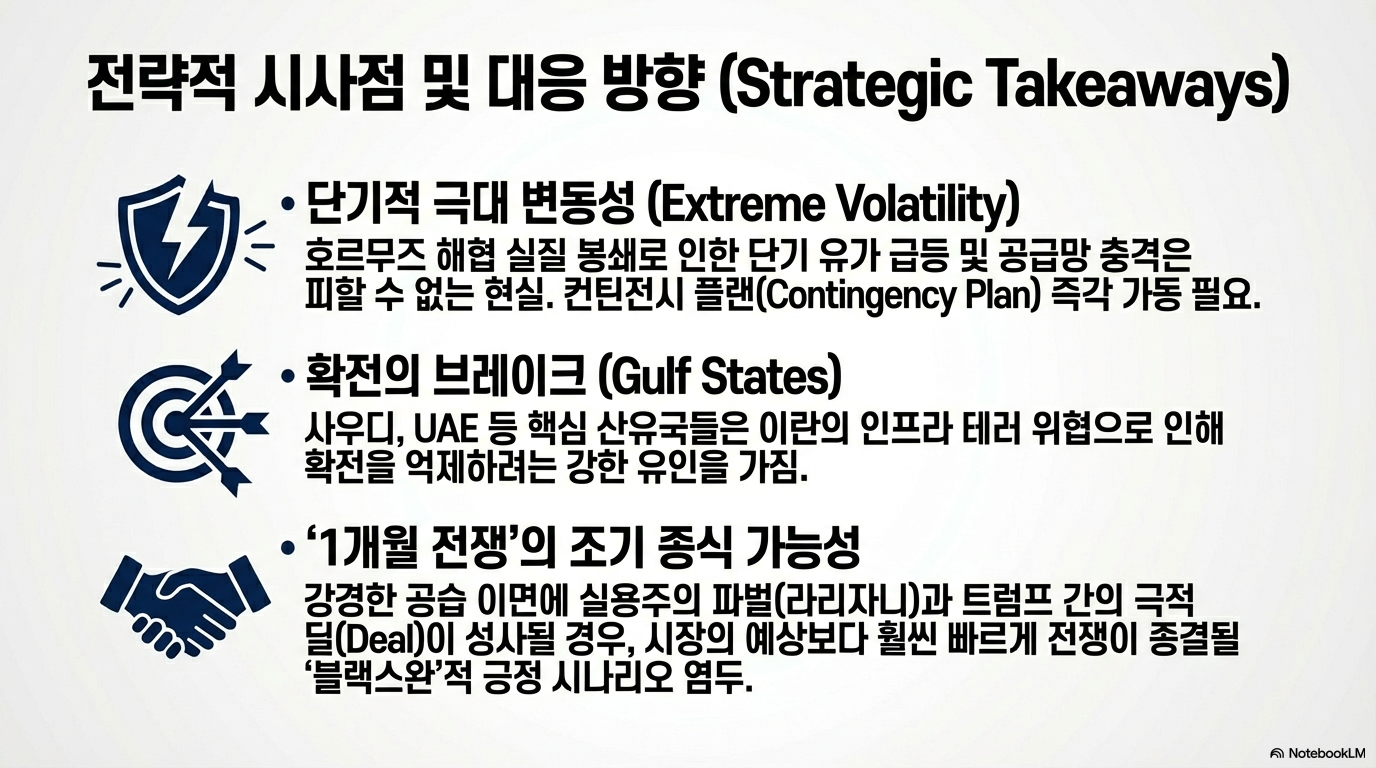 혼돈 속에서도 의외의 돌파구는 포착됩니다. 이란의 실세이자 실용주의자인 **알리 라리자니(국가안보위원회 사무총장)**가 트럼프 대통령에게 협상 신호를 보냈다는 점입니다. 혁명수비대 출신이면서도 외교적 감각을 갖춘 그가 파격적인 양보안을 제시할 경우, 전쟁은 예상을 깨고 '한 달' 이내에 전격 종료될 수도 있습니다.