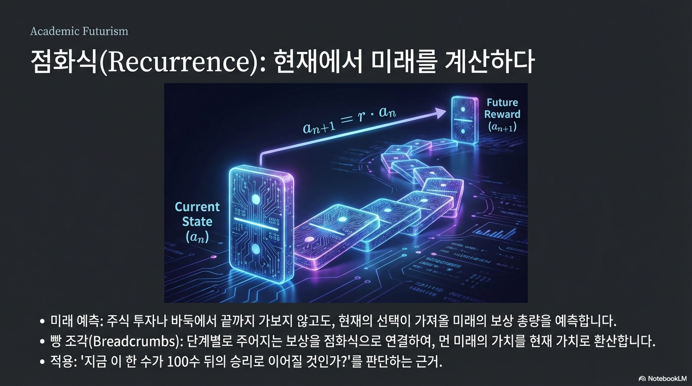 AI는 자신의 행동에 대해 보상을 최대화하는 방향으로 움직입니다. 이때 미래의 행복(수익)을 현재의 결정에 반영하기 위해 **점화식(Recurrence Relation)**과 등비수열의 원리가 사용됩니다. 복리 계산에서 쓰이는 '7%의 법칙'처럼, 오늘의 작은 보상이 점화식을 타고 미래의 거대한 가치로 불어나는 과정을 계산하는 것이죠. "지금 이 한 수를 두는 것이 미래의 승률을 얼마나 높일 것인가?"를 판단하는 논리적 근거가 바로 이 수열의 원리에 있습니다.