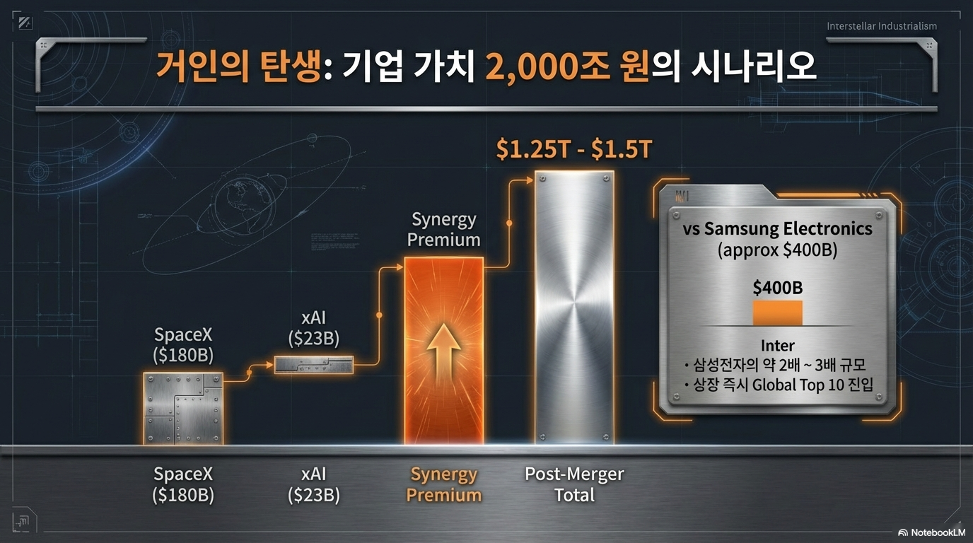 시장에서는 합병 법인의 기업 가치를 약 **1조 2,500억 달러(약 1,800조 원)**로 추산하고 있습니다. 이는 삼성전자 시총의 2배이며, TSMC나 테슬라와 어깨를 나란히 하는 규모입니다. 월가에서는 이 합병 법인이 IPO(기업공개)를 통해 70조 원 이상의 공모 자금을 조달하며 사우디 아람코의 기록을 경신할 것으로 보고 있습니다.