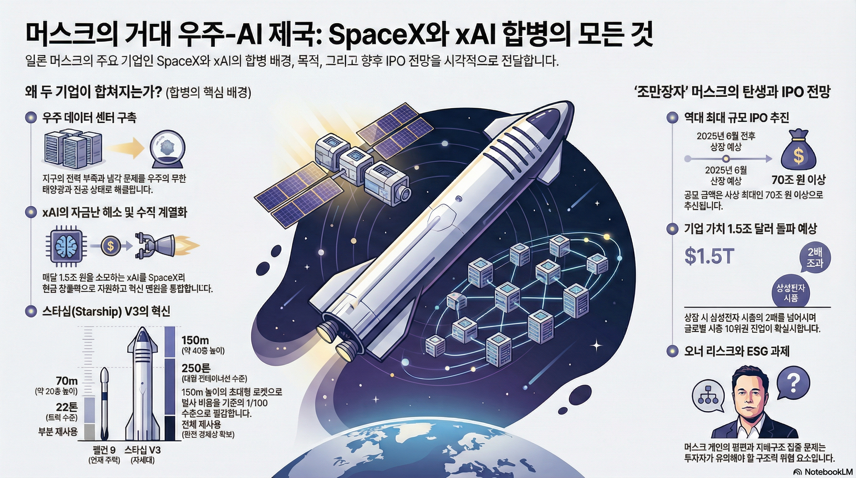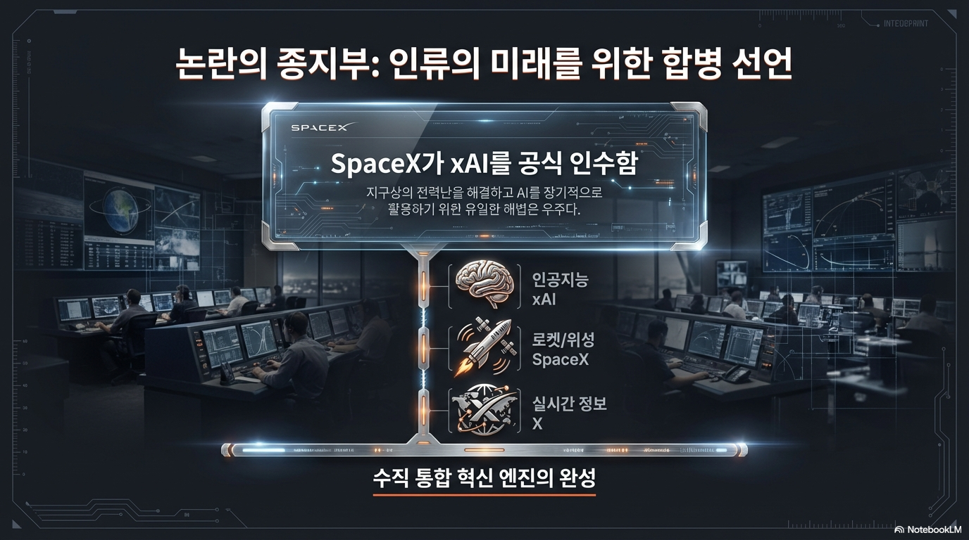 스페이스X와 xAI의 합병은 단순히 기술적 시너지를 넘어, 자본과 기술, 그리고 우주라는 영토가 한 개인에게 집중되는 전무후무한 실험입니다. 머스크는 우주의 에너지와 AI의 지능을 결합하여 인류의 미래를 가속화하겠다는 거대한 도박에 판돈을 걸었습니다.