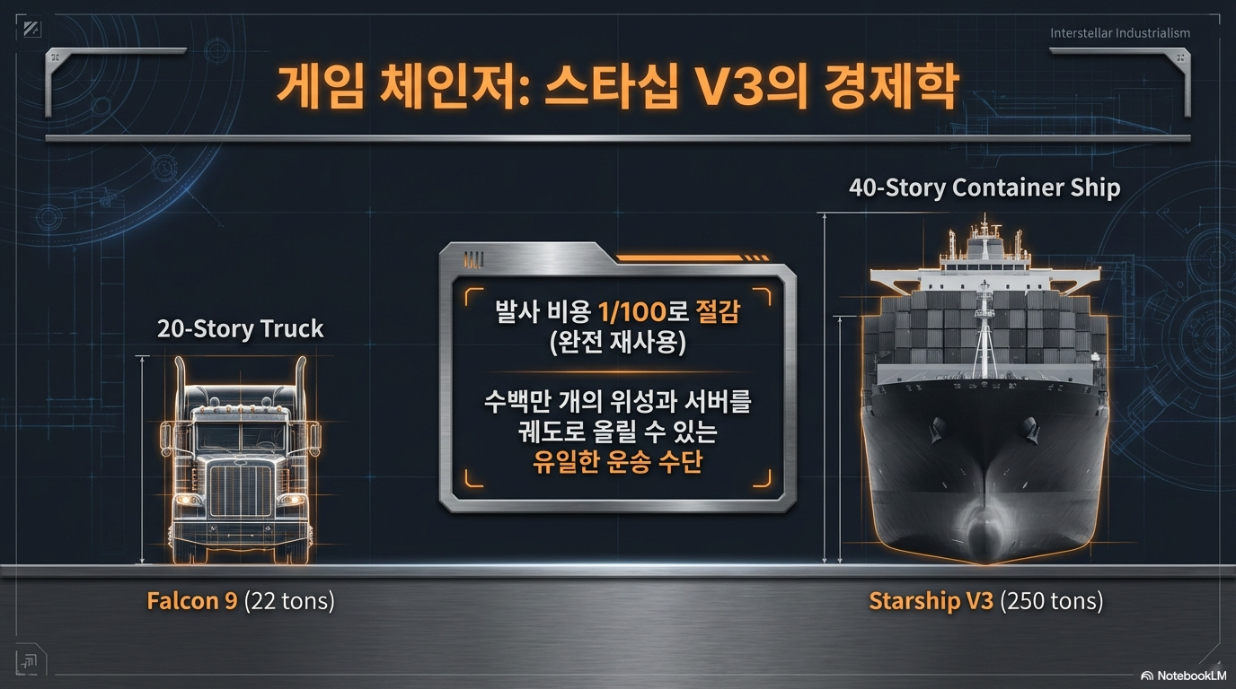 머스크의 야망을 현실로 만드는 하드웨어의 핵심은 차세대 로켓 **'스타십(Starship)'**입니다. 기존 주력 모델인 팰컨 9(Falcon 9)이 높이 70m(20층 건물 규모)의 **'트럭'**이라면, 다음 달 첫 실전 투입을 앞둔 스타십 V3는 높이 150m(40층 건물 규모)에 달하는 압도적인 **'대형 컨테이너선'**입니다.
