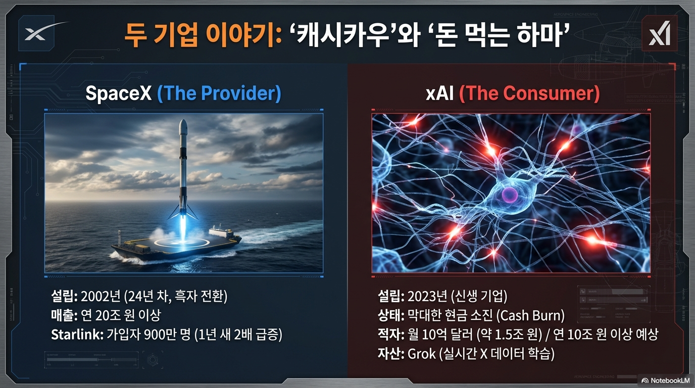 이번 합병의 이면에는 날카로운 재무적 전략이 숨어 있습니다. 현재 xAI는 GPU 확보와 인프라 구축을 위해 매달 10억 달러(약 1.5조 원) 이상, 연간 10조 원이 넘는 막대한 자금을 소진하는 ‘현금 블랙홀’ 상태입니다. 반면 스페이스X는 스타링크의 폭발적인 성장세에 힘입어 연 매출 20조 원을 상회하며 흑자 구조를 안착시킨 ‘캐시카우’입니다.