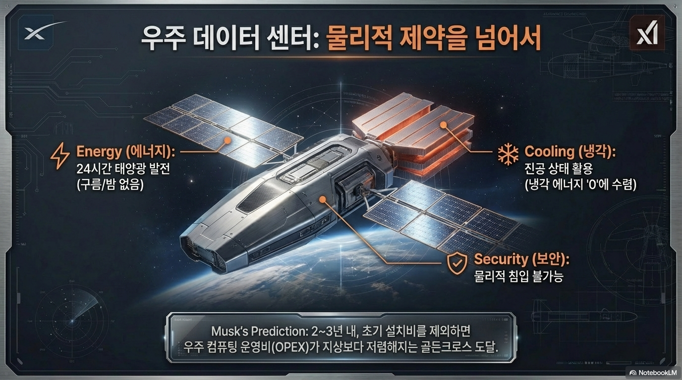우주는 AI 연산을 위한 ‘기회의 땅’입니다. 대기의 방해가 없는 우주에서는 무한한 태양광 에너지를 무료로 얻을 수 있으며, 진공 상태의 환경은 지상 데이터 센터 유지 비용의 절반을 차지하는 냉각 비용을 획기적으로 절감해 줍니다. 머스크는 2~3년 내에 우주 데이터 센터 구축 비용이 지상을 앞지를 것이라는 철저한 자본 논리에 입각하여, 인류 최초의 ‘외계 연산 인프라’를 구축하려 합니다.