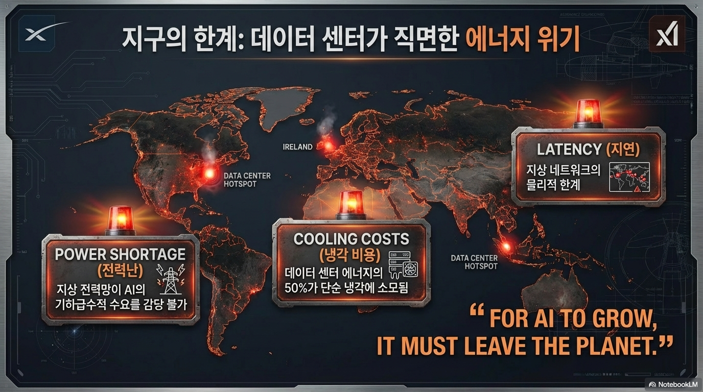 머스크가 이번 합병의 명분으로 내세운 것은 역설적이게도 ‘지구의 한계’입니다. AI 모델이 고도화될수록 천문학적인 전력 소비와 발열 문제는 지상 데이터 센터의 생존을 위협하는 요소가 되었습니다. 머스크는 스페이스X 홈페이지를 통해 인류가 마주한 물리적 제약을 다음과 같이 단언했습니다.