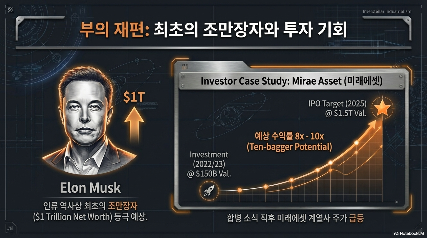 특히 흥미로운 것은 상장 시점을 둘러싼 소문입니다. 머스크의 55세 생일인 2026년 6월 28일에 맞춰 상장을 단행할 것이라는 예측이 우세합니다. 해당 시기는 목성과 금성이 3년 만에 가장 가깝게 만나는 드문 행성 정렬 시기로, 우주 제국을 꿈꾸는 머스크 특유의 드라마틱한 연출이 반영될 것이라는 분석입니다. 상장이 성공하면 머스크는 개인 자산 1조 달러를 돌파하는 인류 역사상 최초의 **'조만장자(Trillionaire)'**가 될 전망입니다.